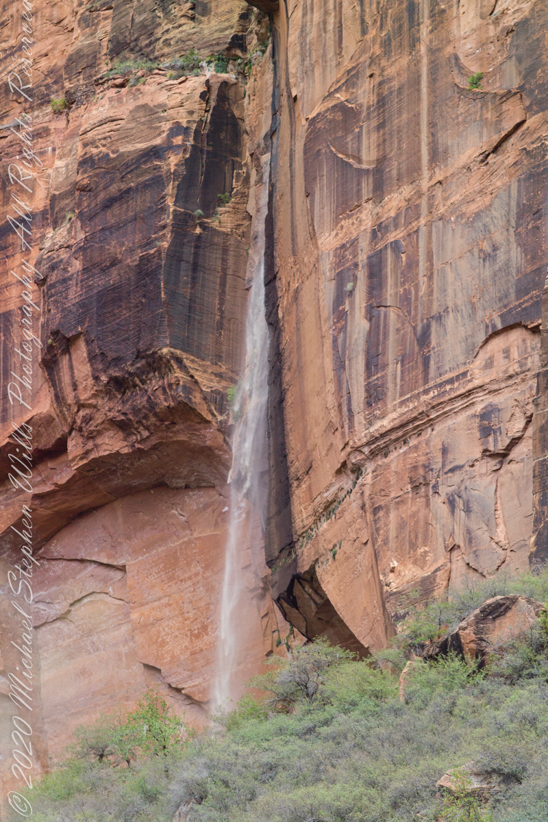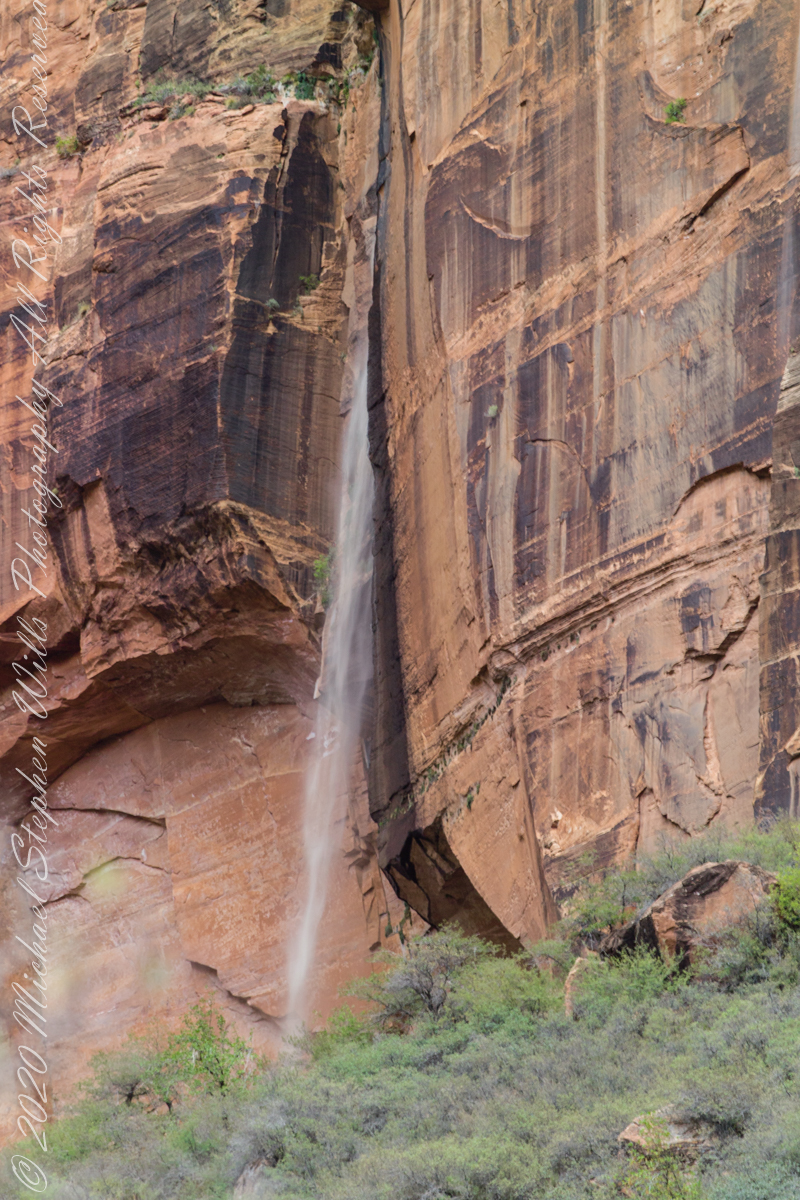The hard rock cliffs are resistant to wear and, in this climate, weather to provide rounded surfaces. The cliff face is scalloped and marked with desert varnish striations that “pop out” from the red rock. Then, there is the clear light and bright morning sky on a summer morning that promised thunderstorms.
