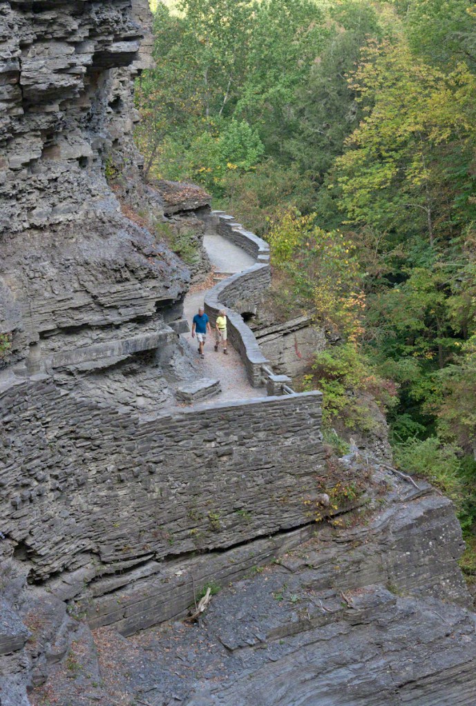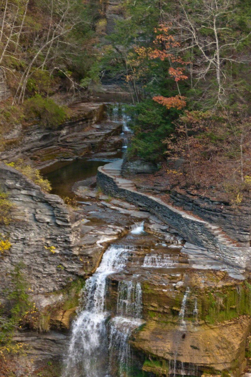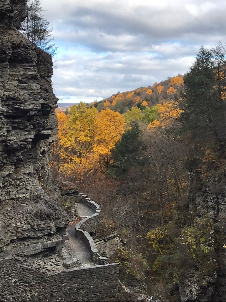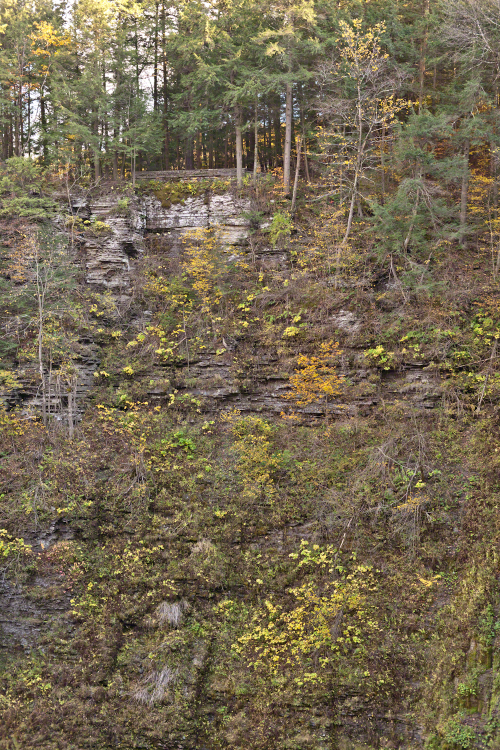 Standing next to the falls on the Gorge Trail, the stone wall of the Rim Trail Overlook is overpowered by the grandeur of the 300+ foot cliff. The falls photographs were taken from behind the wall.