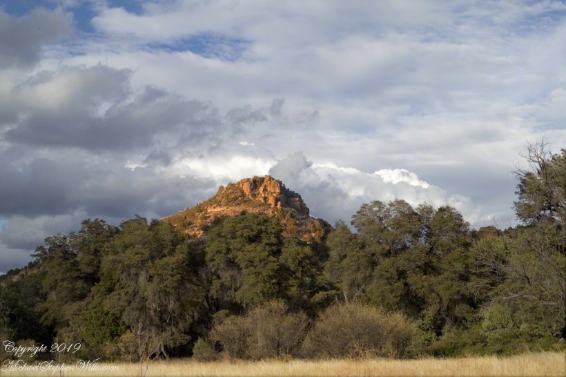 In the near distance a grass pasture slopes into Reavis Creek. The creek has flowing water in all but the longest dry seasons. By the way, the trail from Pine Creek is on the slopes of that conical feature in the distance, to the left.