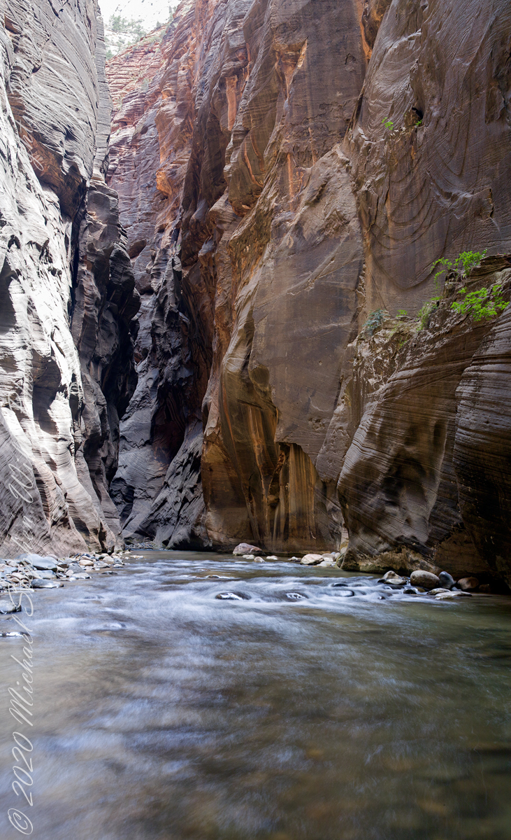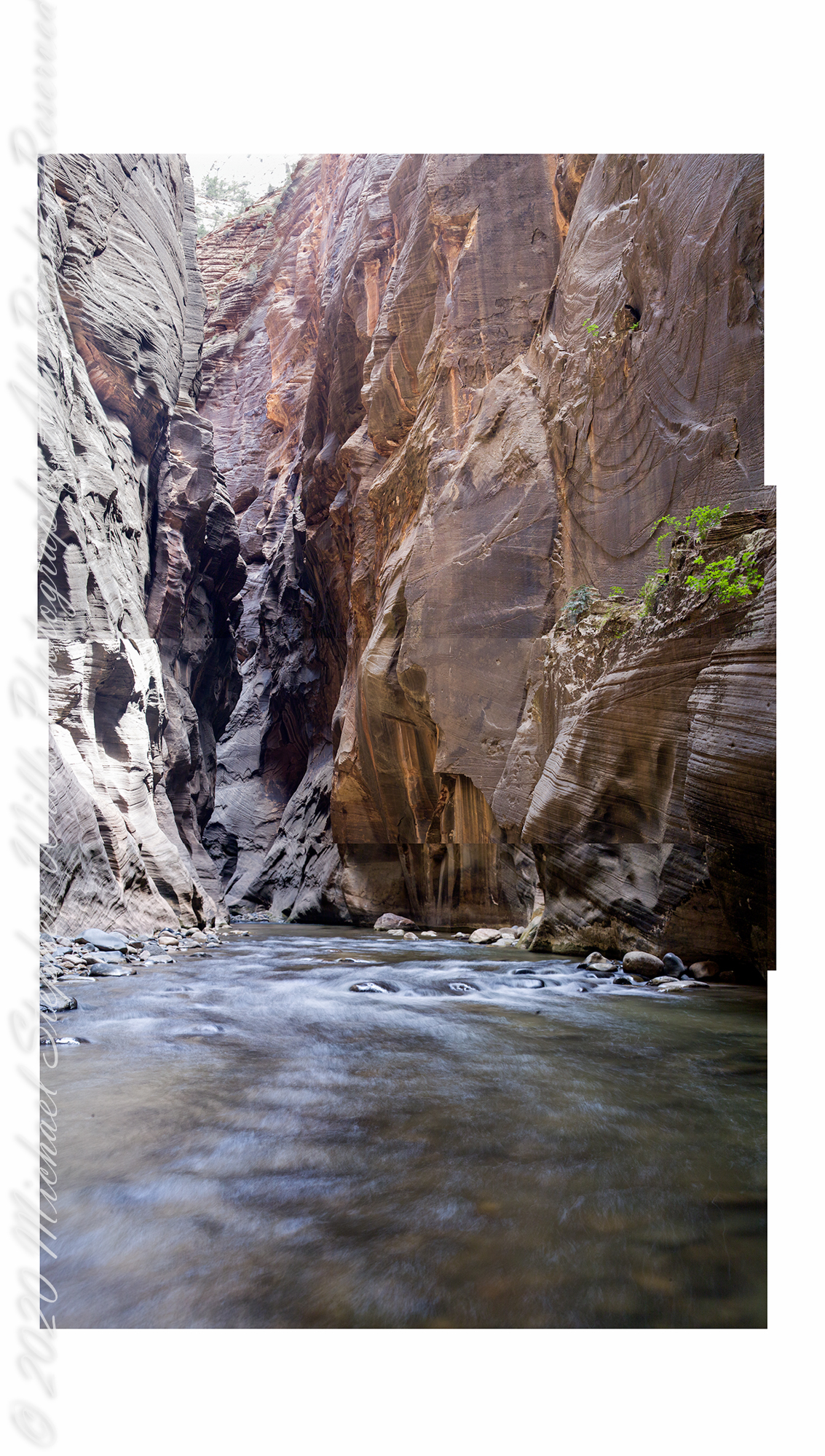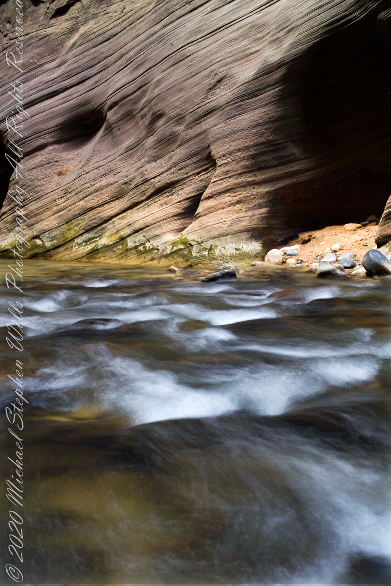 In Zion National Park, where towering sandstone cliffs rise from the desert floor, the Virgin River weaves a persistent and graceful thread through deep canyons carved over millennia. The river is the creative force behind Zion’s signature landscape, sculpting stone with a patient hand. Among its greatest achievements is the Narrows—a sinuous gorge where water and light perform a timeless duet. The two photographs shown here draw us into an intimate corner of that realm, where water flows past a rock face marked by both subtlety and drama.
