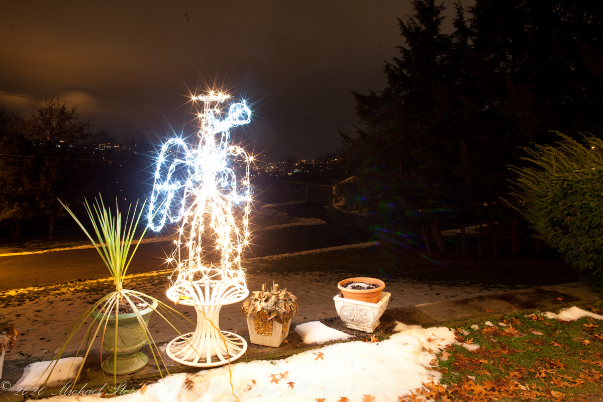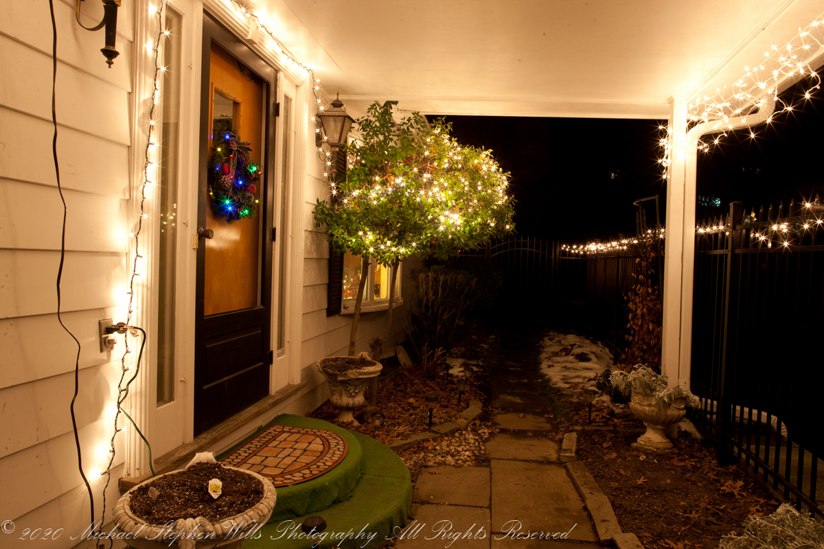 The wonder of electricity through a timer, lights greet the sunset offering cheer until, precisely 4 hours later, surrender to the night UNLESS there is a power outage and the lights return for a renewed countdown.