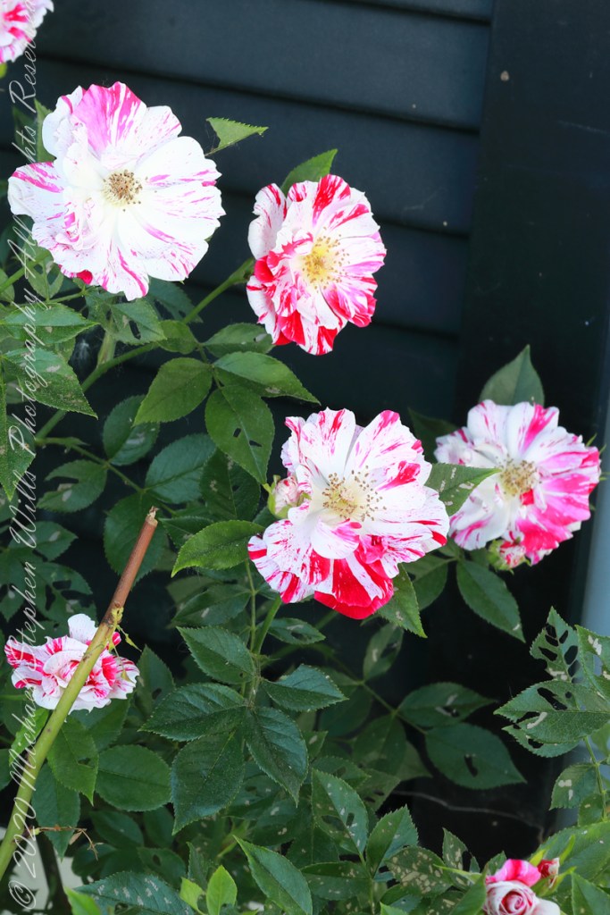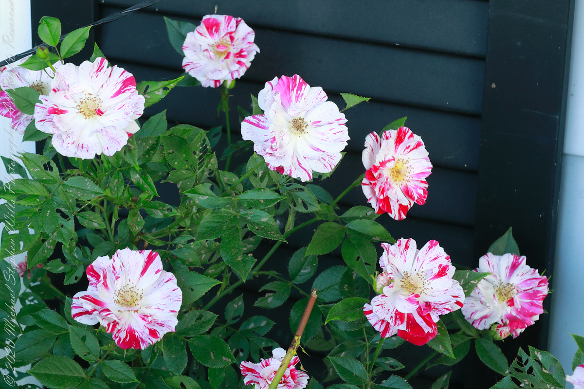 It is a miniature rose, the blooms about 1.5 inch across, this and the irregular red and white coloring reminds me of peppermint candies, so we call it our peppermint rose (not to be confused with the “Peppermint Rose” branded doll). The descent from wild rose is clear in the simplicity of the form. The number of flower petals identify it as a hybrid “modern rose: there are many more than five (5) petals of the wild rose.