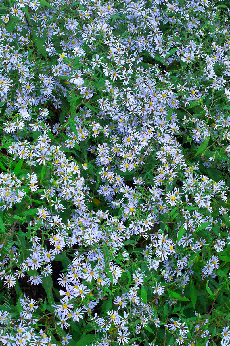 A mass of lavender asters produced for a painterly, restful esthetic. Over the years I have tended beds of these wildflowers. The sunlight of late August/early September here in the Finger Lakes is especially clear and this is when these asters bloom. This were caught on a clear September evening with the sun just behind a stand of large Ash trees.