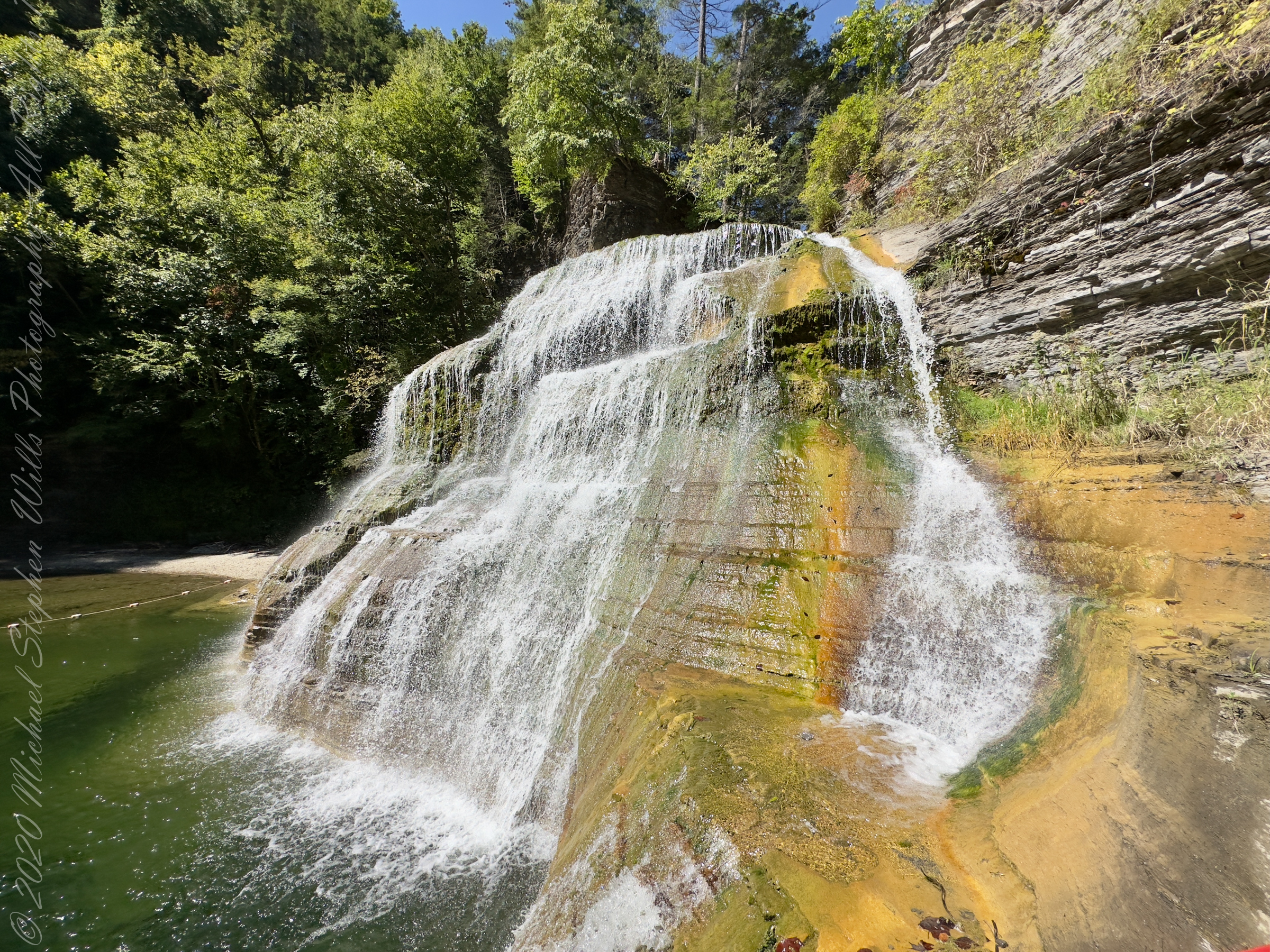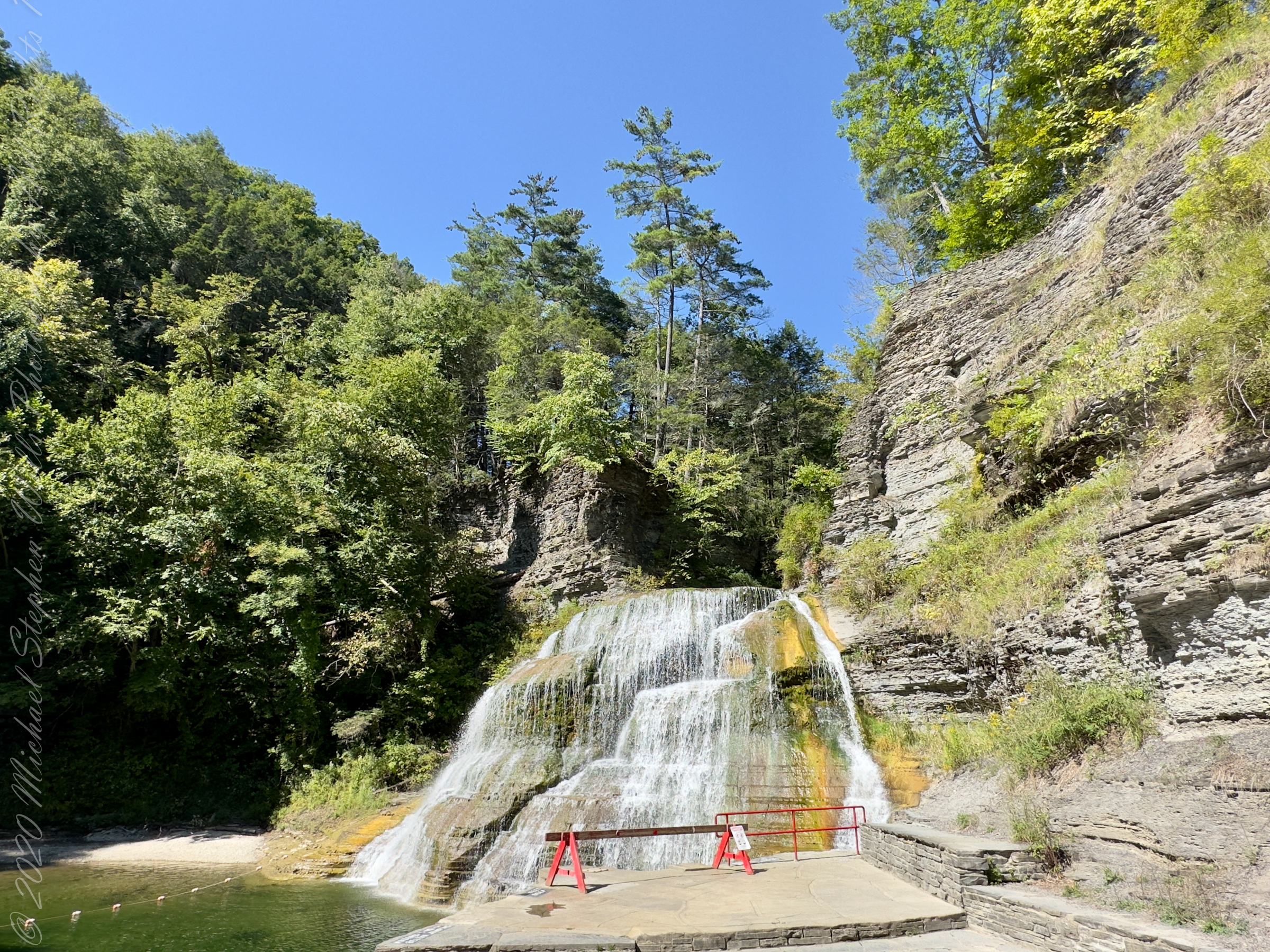 Daring visitors jump from the wall at right into a plunge pool, seen here as the quiet water at base of wall. It is a doubly dangerous activity as the force of water can hold a swimmer under indefinitely, missing the narrow pool results in striking the rocks. Robert H. Treman New York State Park, Tompkins County, Ithaca, New York.