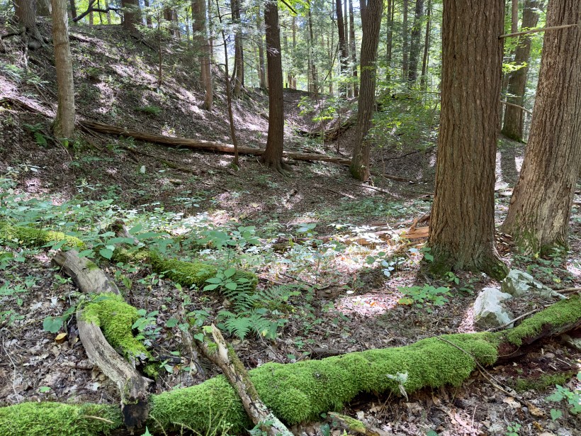 Over a period of 11,000 years this former stream bed, abandoned when a melting tongue of the Laurentide Ice Sheet deposited drift across Enfield Creek, transformed to this sun dappled glade, one of two along the Gorge Trail of Treman Park.
