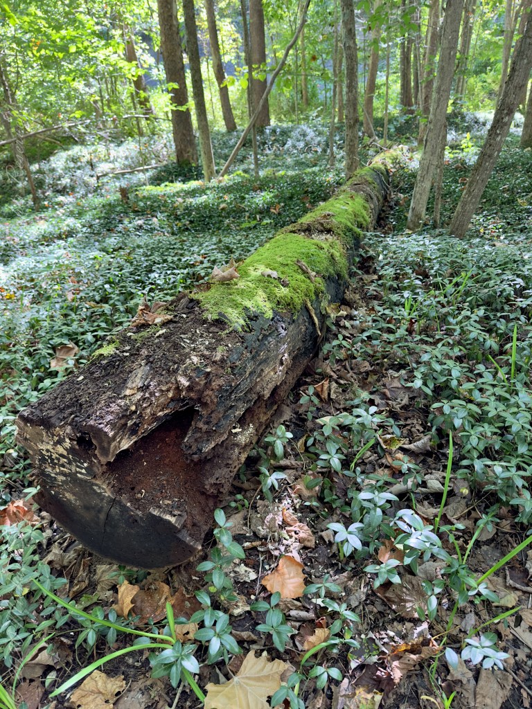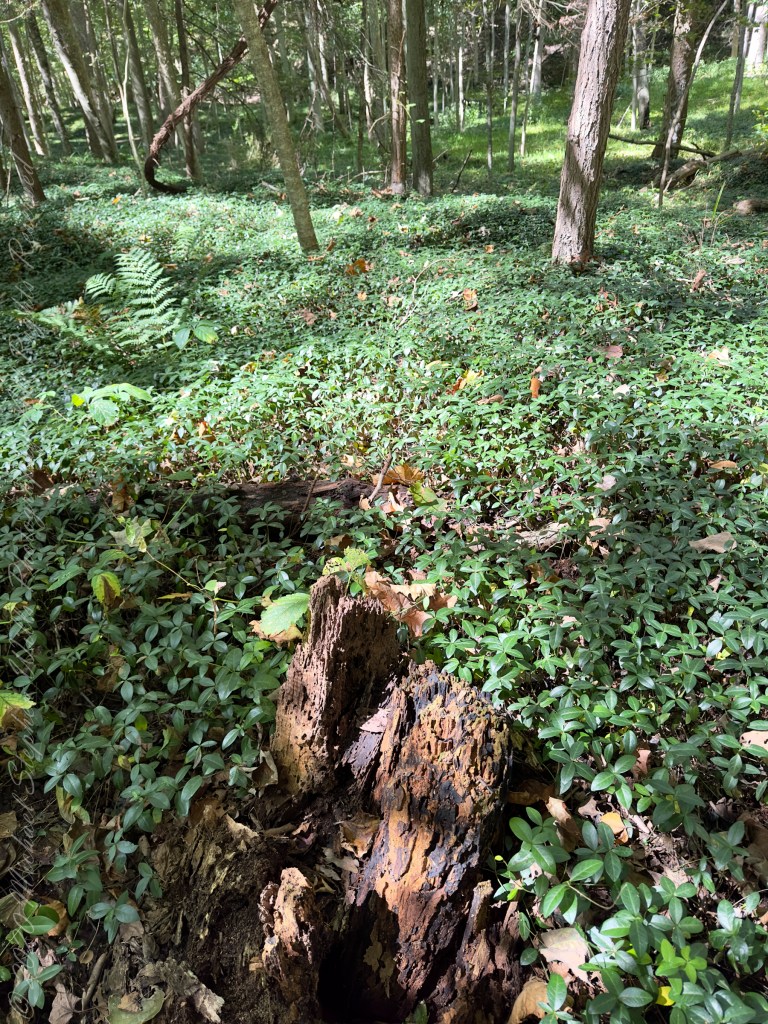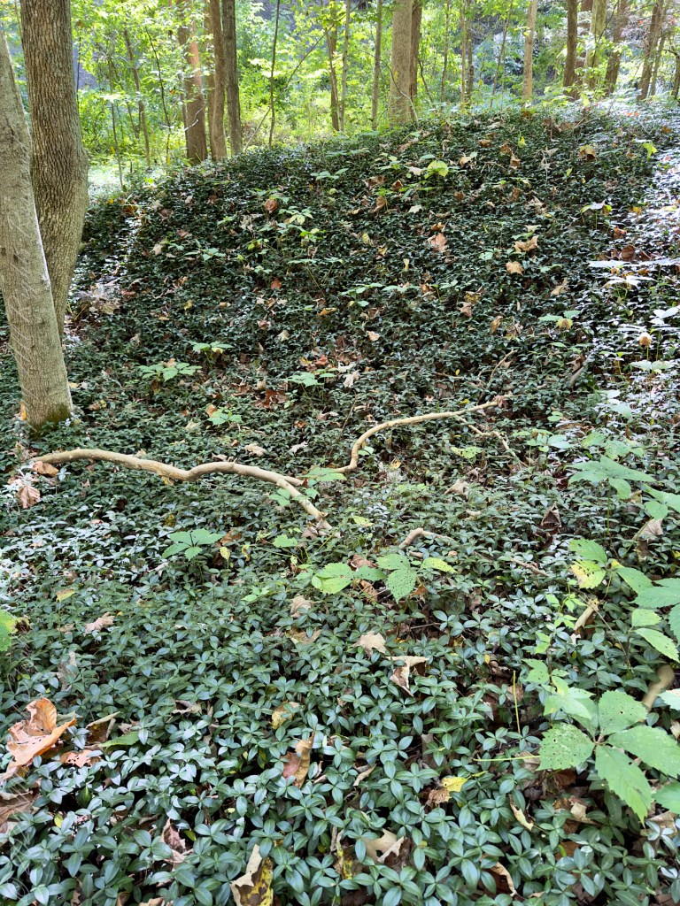 It is possible this is a cemetery as myrtle was once commonly planted in cemeteries in parts of the United States and naturalized periwinkle may indicate the presence of graves whose other markers have disappeared.