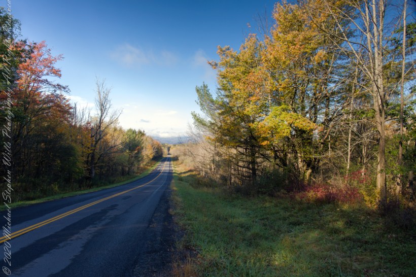 On our roundabout return from Finger Lakes National Forest we turned off Rt 79 at Mecklenburg onto county route 6 that becomes McIntyre Road in this stretch between two right angle curves. We turned off at the western curve with this fine autumn overlook toward Buck Hill.