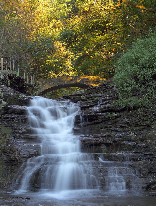 I descend into the shade. A narrow stream runs over the flat gray ledges of the Ludlowville Formation, forming delicate waterfalls no taller than a man but intricate as lace. One fall, framed by a colonnade of black cherry and beech trees, poured over stone like a ribbon of silk. The water’s voice changed with each ledge—first a murmur, then a chuckle, then quiet confidence as it wound through the woods.