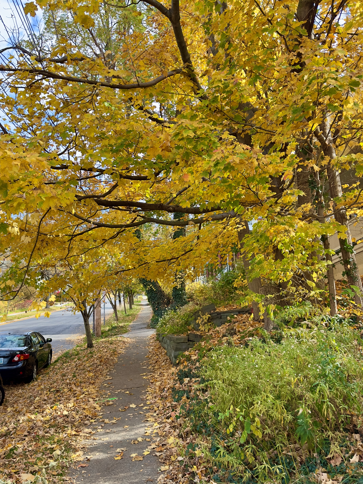 Continuing up Buffalo Street, I marveled at the trees, their branches thick with yellow and gold leaves, creating a canopy above. The leaves shivered with every gust, whispering the ancient secrets of the forest. The air was infused with the sweet, woody fragrance of maple and oak, mingling with the faint scent of chimney smoke from nearby houses. The sunlight filtered through, casting a dappled pattern on the sidewalk, a fleeting mosaic as the leaves danced in the wind. A sense of impermanence struck me; soon, these leaves would be gone, leaving bare branches silhouetted against a winter sky.
