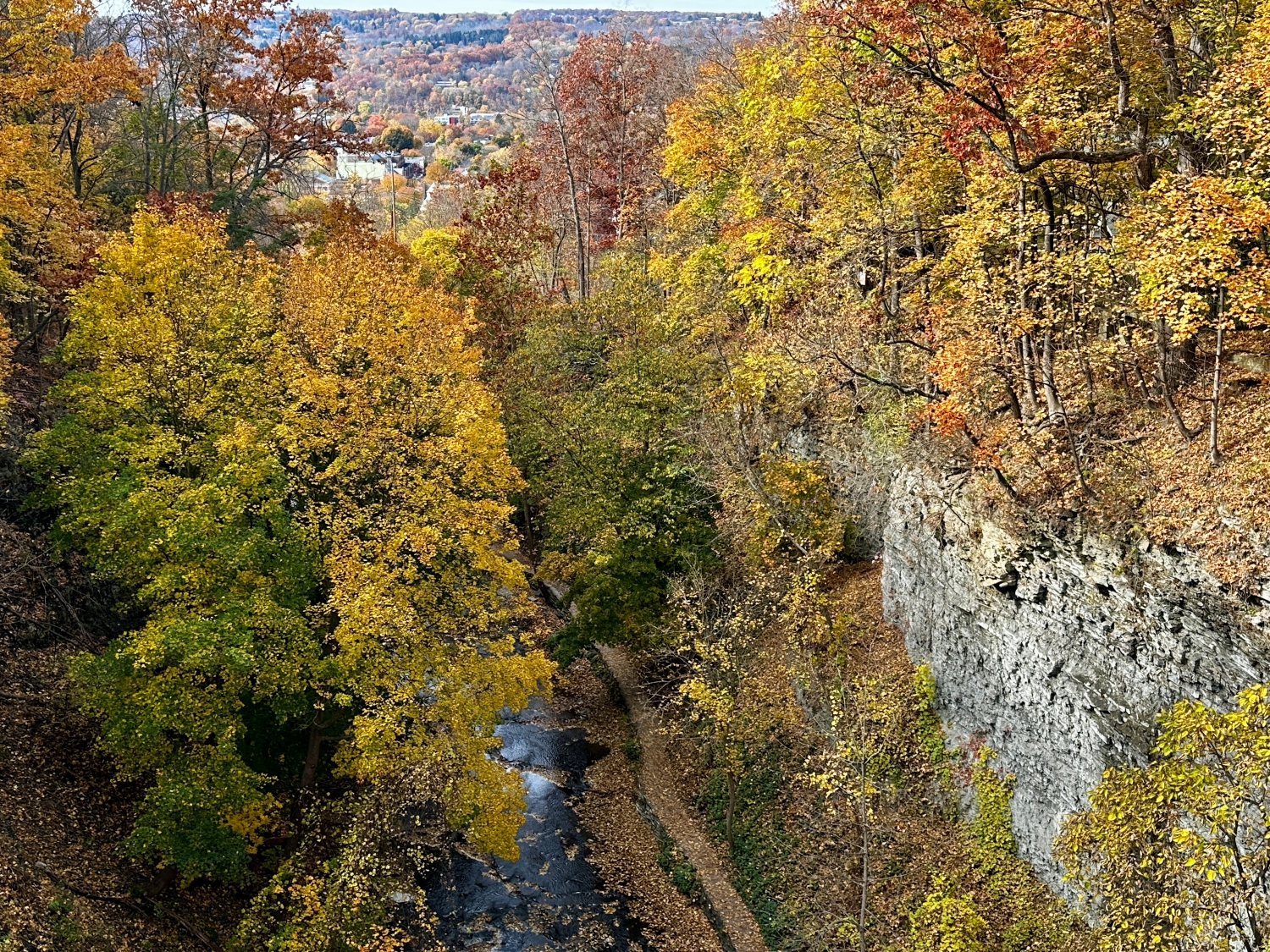 A few days before Halloween, I found myself on the rim of Cascadilla Gorge, Ithaca’s autumnal crown jewel. The air had that crisp October quality, each breath carrying a hint of the colder days to come yet still tempered by the lingering warmth of early fall. A breeze carried a scent of damp earth and decaying leaves, a rich, organic aroma that signaled the turning of the seasons. The path beneath my feet was a tapestry of fallen leaves—russet, gold, and burnt orange—a natural carpet leading me through a world suspended between vibrancy and rest.