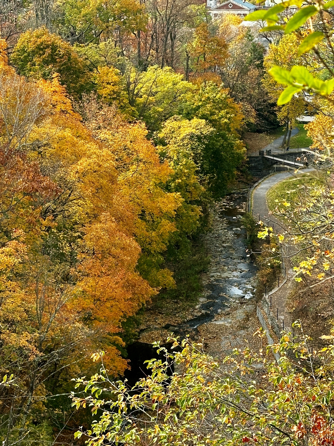 The last stretch of steps is leaf blanketed, their shapes and colors a beautiful final mosaic before I emerge from the shaded coolness of the gorge. The sun filters down through the thinning trees, illuminating the stone buildings of the Cornell campus that peek through the branches ahead. With each step, I feel the transition, moving from the curated wildness of Cascadilla Gorge and its trail to the structured beauty of the university grounds.