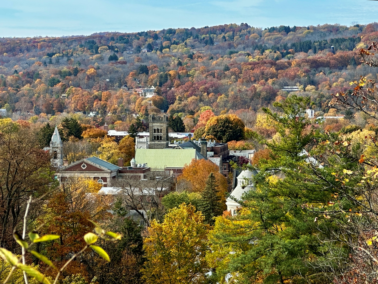 I stopped at a lookout point and surveyed the town sprawled out below, nestled amidst the fiery colors of the surrounding hills. The architecture of Ithaca’s buildings peeked through the trees, each roof and spire framed by the season’s palette. This was a town embraced by nature; its rhythm dictated as much by the seasons as by human hands. The sight stirred a sense of gratitude within me; here was a place that reminded you to slow down and observe, to notice the subtle shifts in light, in color, in the way a single gust of wind could change a landscape.