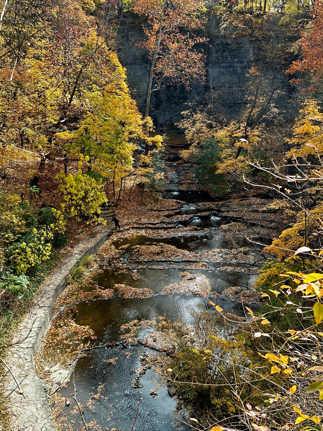 Crossing the Stewart Avenue bridge, the Cascadilla Gorge came into view, a steep wall of stratified rock layers standing guard over the gently flowing stream below. The contrast between stone and foliage was breathtaking—the hard, unyielding rock juxtaposed with the softness of leaves in full autumnal bloom. The earthy scent of wet stone mixed with the crisp aroma of the flowing water, creating a sensory tapestry unique to the gorge. The colors seemed to intensify against the gray and brown of the cliff, each leaf like a brushstroke on nature’s canvas, celebrating the season’s final flourish before surrendering to winter.