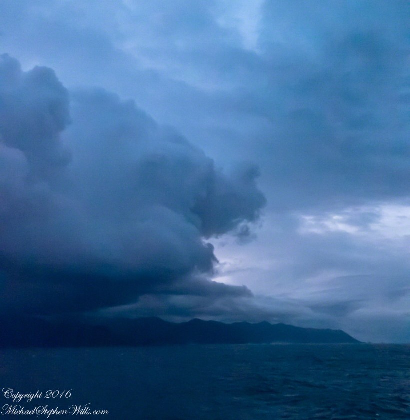 Taken with a tripod mounted Sony DSLR A 700 DT 18-200 variable lens set to 18 mm. 1/40 second at f4.5 ISO 6400. The sun was still low, after sunrise with gathering storm clouds from the terrace of our state room (a moving ship).
