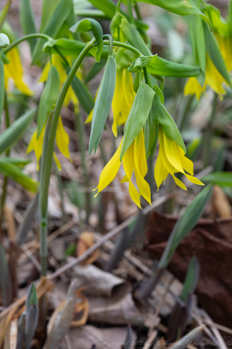 Large-flowered Bellwort is a woodland perennial of rich deciduous forests, and it wears that identity in every part of its form. The stems rise smooth and pale, slender but assured, each seeming to carry its burden effortlessly. The leaves clasp the stem in that distinctive bellwort manner, as though the plant were being held in green hands. Beneath them hang the flowers, elongated and drooping, their six yellow tepals twisted and tapered into points. They are not the symmetrical stars of more open-faced blossoms. They are pendants, streamers, tassels of sunlight. In these flowers, yellow becomes motion. Even when still, they seem to trail the memory of a breeze.