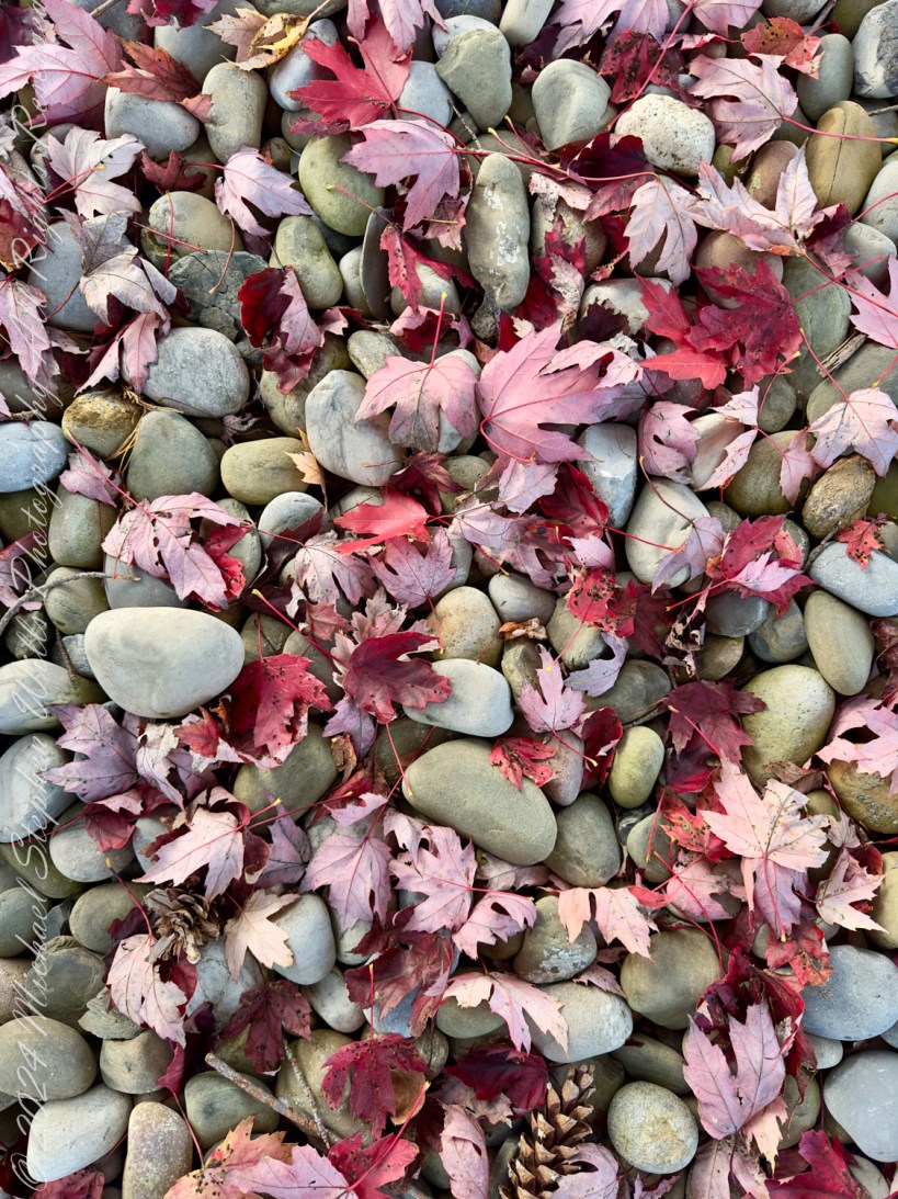 The first scene that caught my eye was a delicate scattering of maple leaves over smooth, weather-worn stones. The contrast between the rigid rocks and the soft, decaying leaves reminded me of life’s cyclical nature. The bright red and pale pink hues of the leaves, now beginning their slow decomposition, seemed to symbolize the passage of time—how even in their decay, they added beauty and texture to the scene. The leaves, having served their purpose on the tree, now danced with the wind, finding a new purpose in creating a natural mosaic. Much like how Pam’s healing journey is both the end of one struggle and the beginning of a new phase in our lives.
