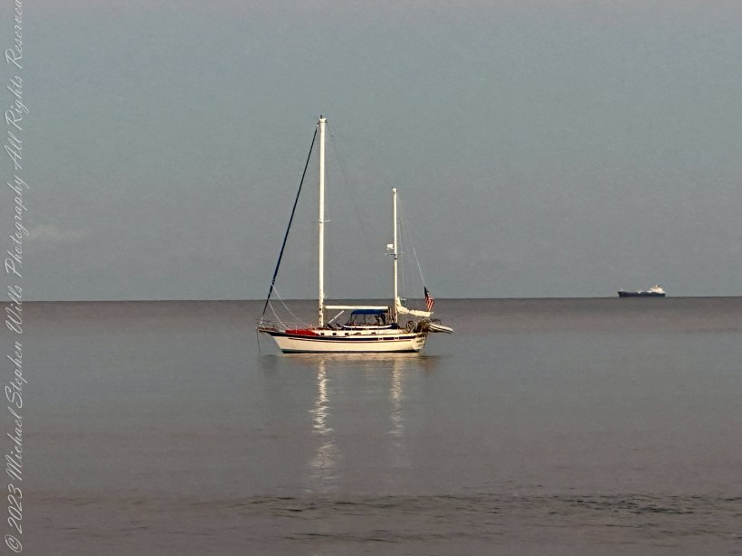 The beach was quiet, the sounds of the day giving way to the evening’s peaceful lull. The sailboat’s stillness was a stark contrast to the perpetual motion of the cargo ship, each representing different paths on the water’s vast canvas. One was an emblem of leisure and simplicity, the other of industry and complexity. Both near and far, they were the day’s quiet companions, their stories part of the fabric of the Space Coast.