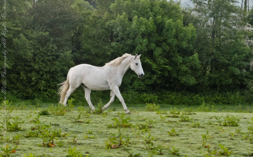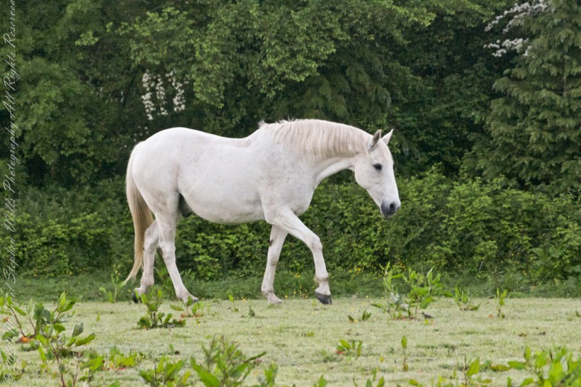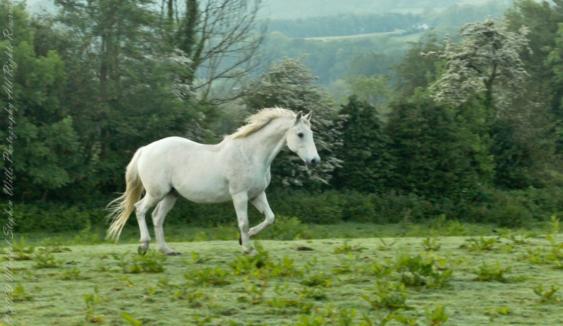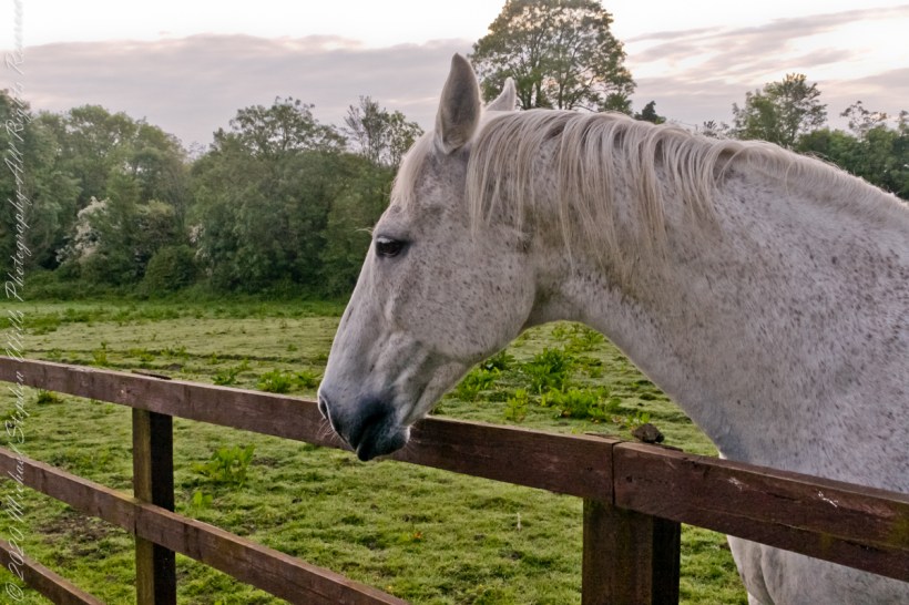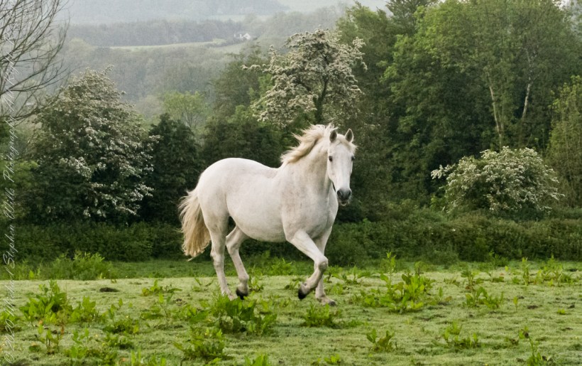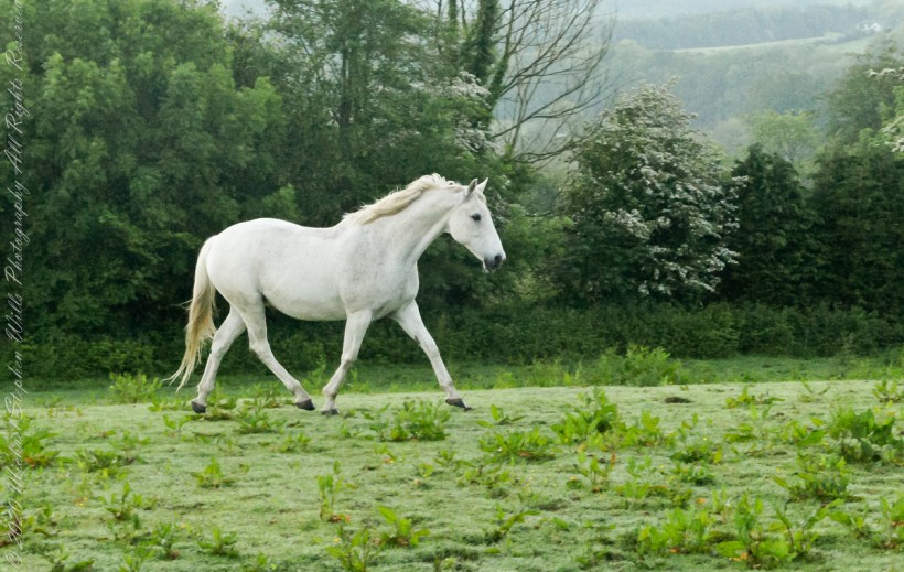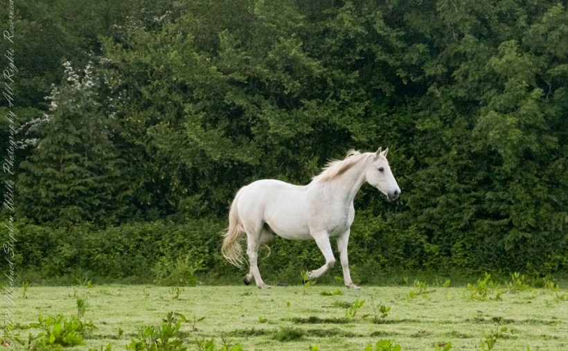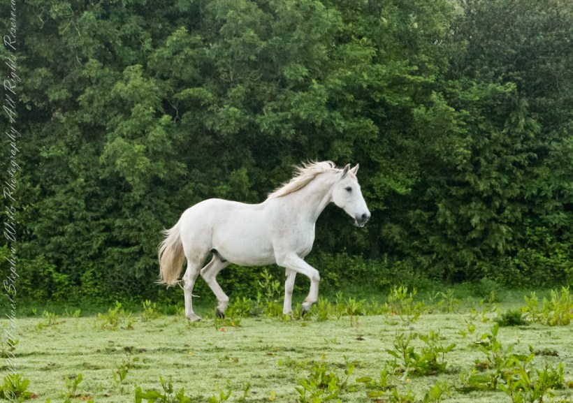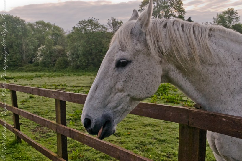 Continued….yesterday included a view along a fairway of Saint Ann’s Hill on which Marantha House B&B is sited. Not far away was a pasture where Charlemagne, a rescued former show horse lives. Our first evening, the one just before this morning, I brought an apple out to Charlemagne. The next morning I returned with another apple to share. Charlemagne rewarded me with a brilliant approach I captured below with my Sony Alpha DSLR with variable lens.