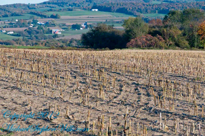 Ripe corn on Malloryville Road from a hill above the Fall Creek valley.