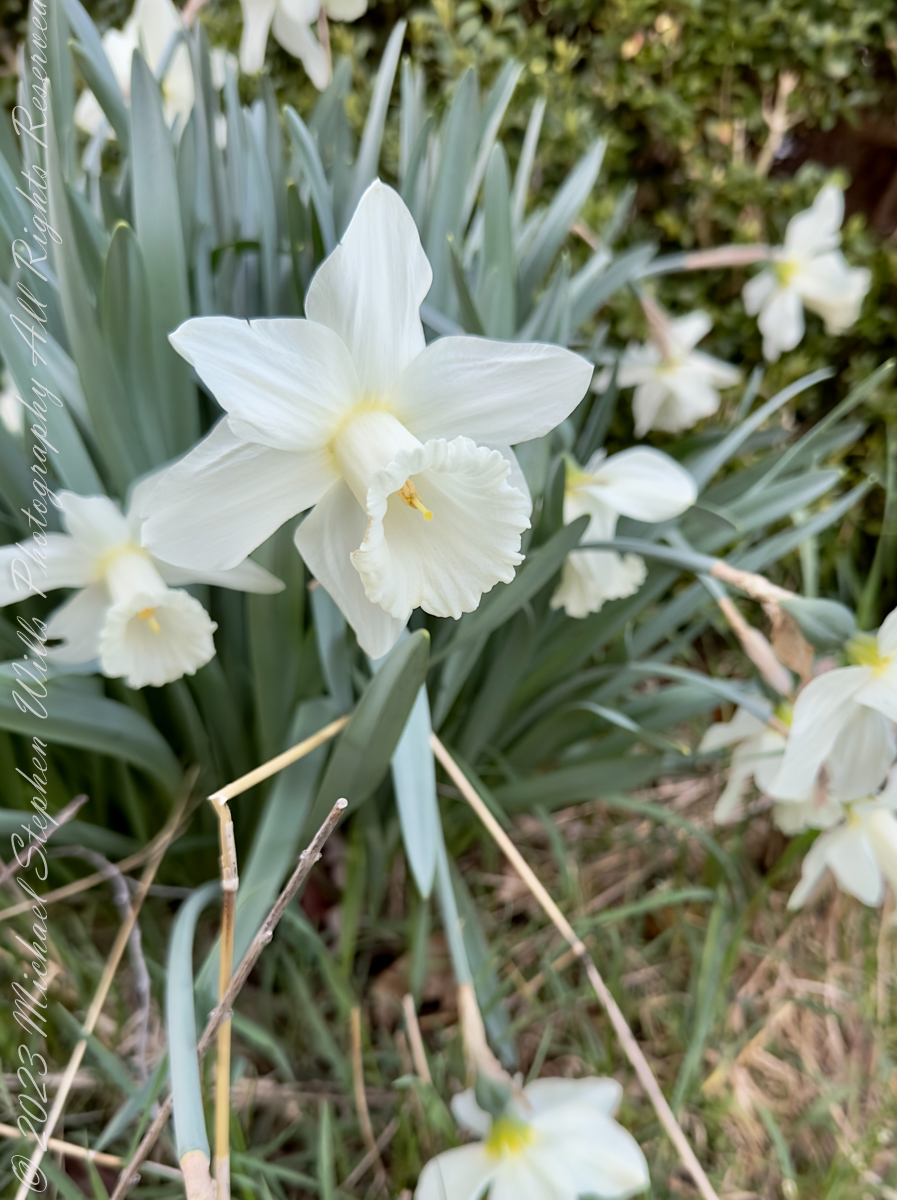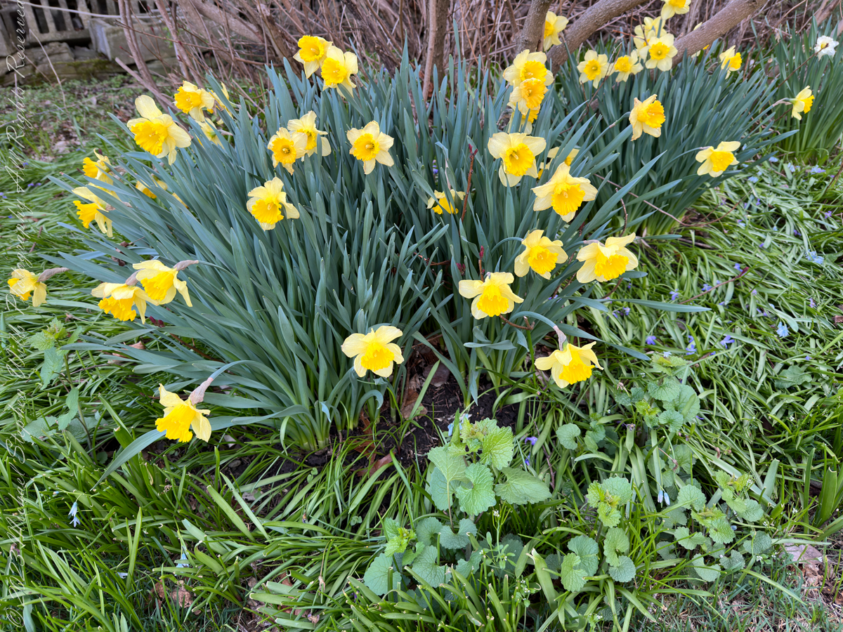 More about Forsythia, from Wikipedia: Narcissus is a genus of predominantly spring flowering perennial plants of the amaryllis family, Amaryllidaceae. Various common names including daffodil, narcissus, and jonquil are used to describe all or some members of the genus. Narcissus has conspicuous flowers with six petal-like tepals surmounted by a cup- or trumpet-shaped corona. The flowers are generally white and yellow (also orange or pink in garden varieties), with either uniform or contrasting colored tepals and corona.