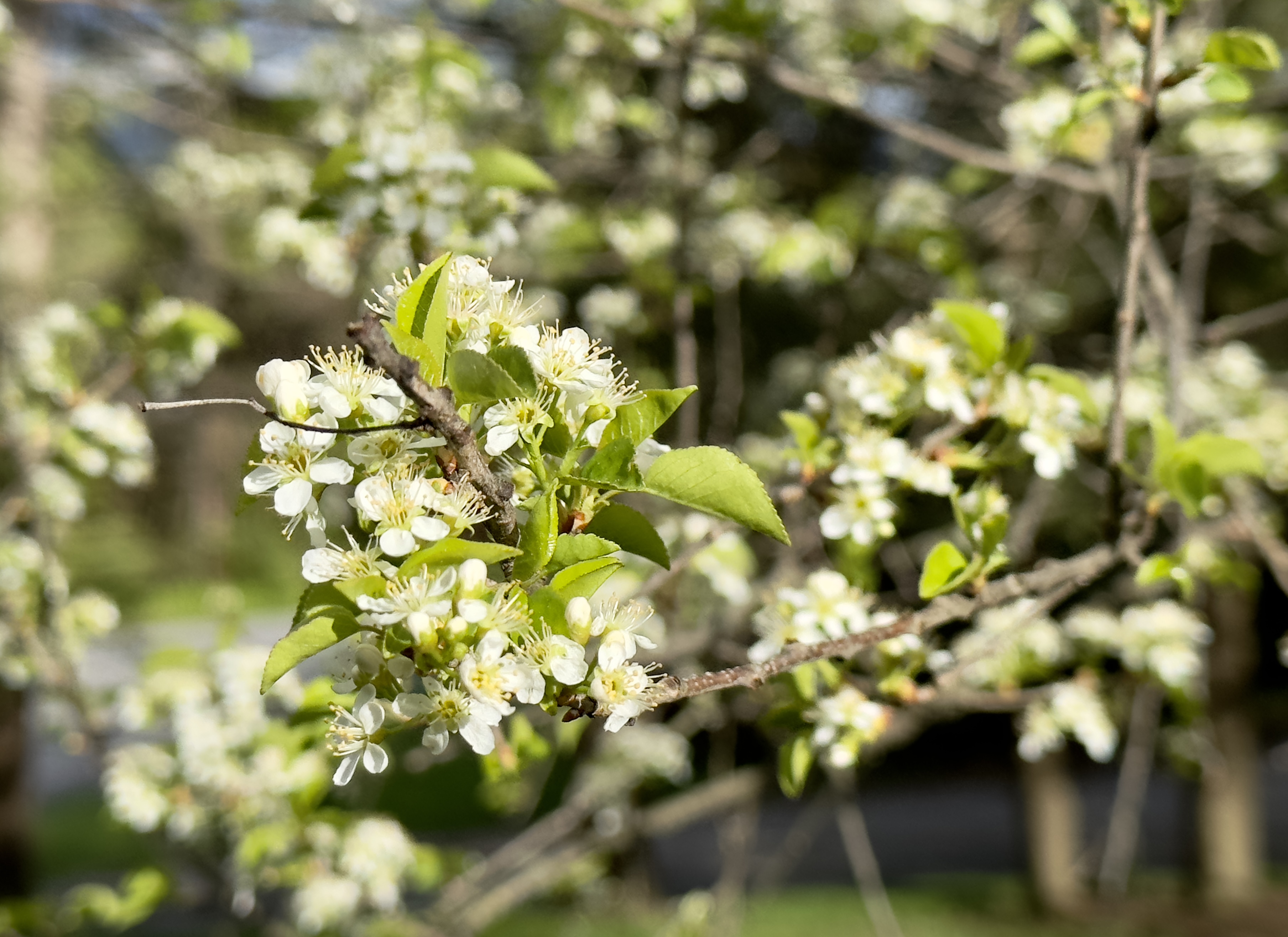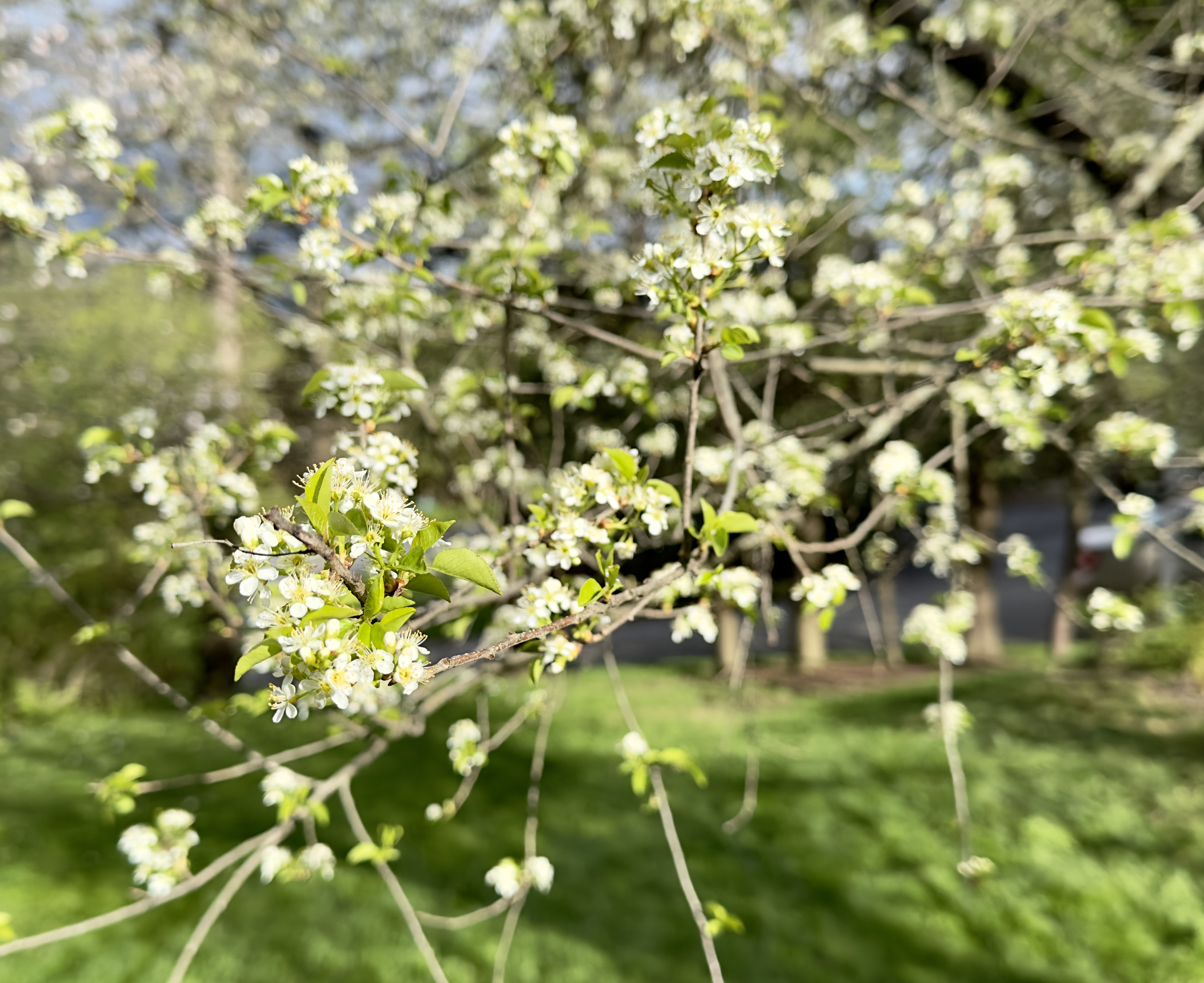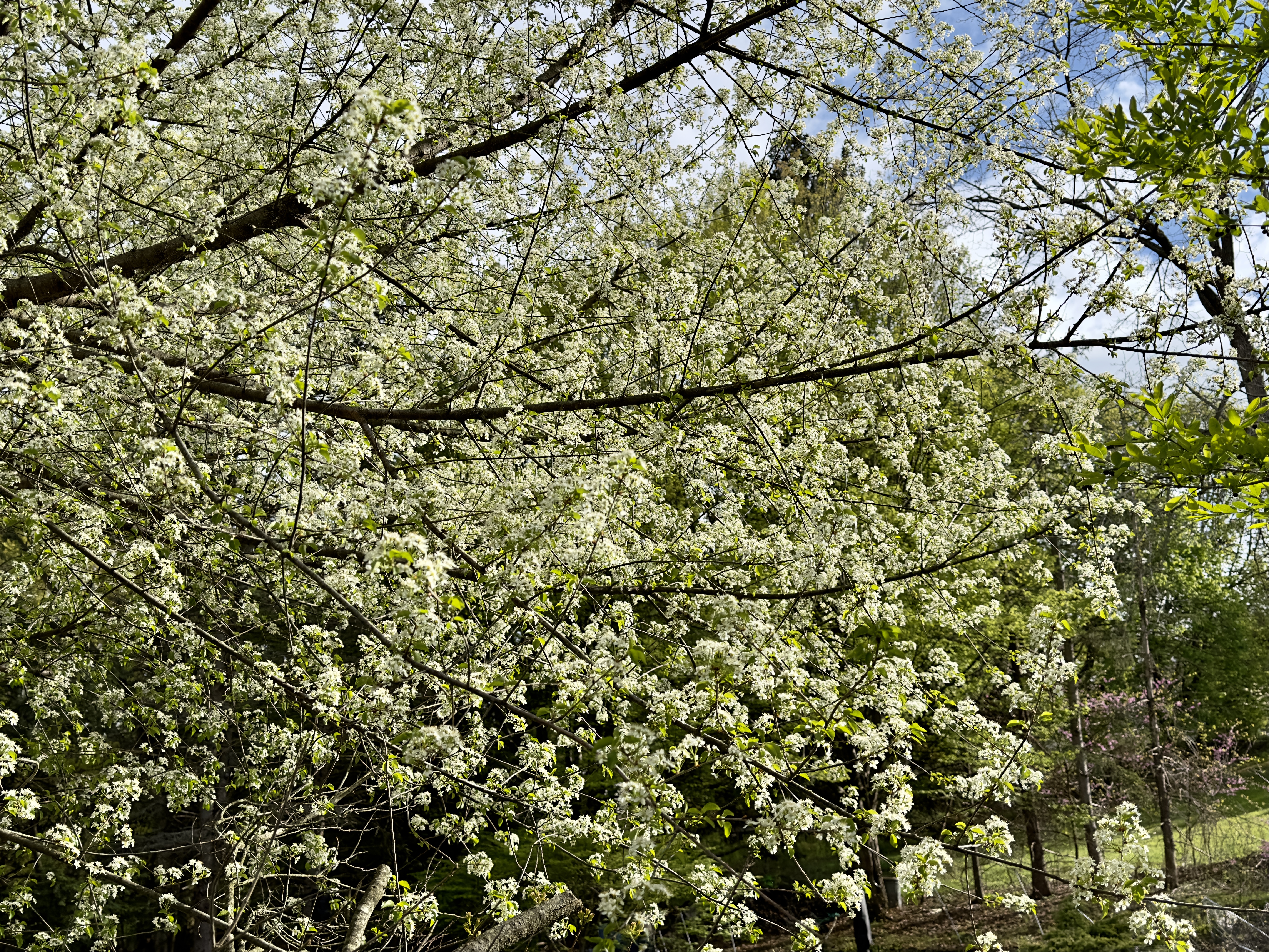 This was an exceptional year for blooms. starting late April, lasting into May. The fence around trunks is for protection against bucks (male deer), from rubbing their horns in autumn.