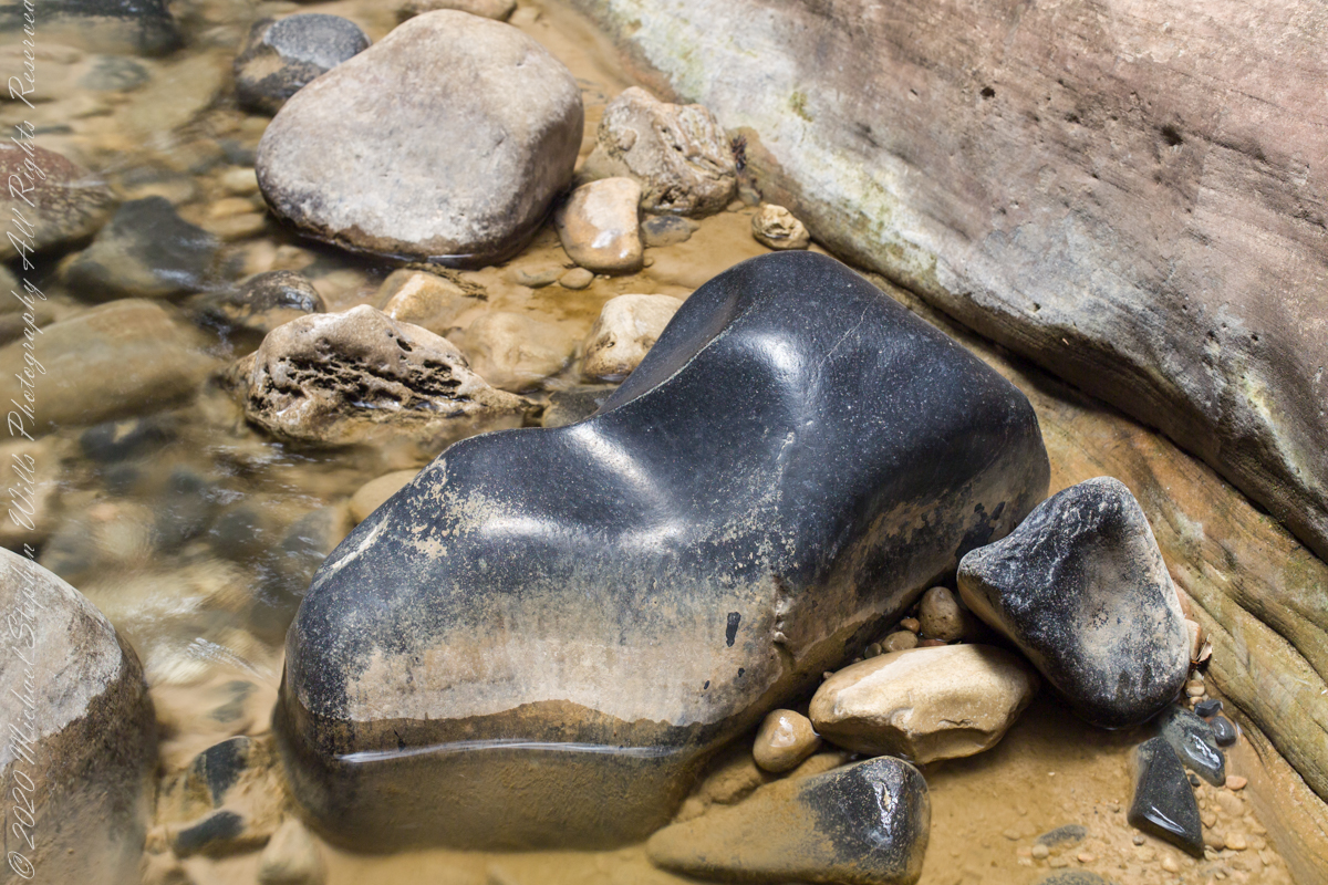 In the first photograph, the scene is bathed in soft, diffused light, lending a quiet tone to the flowing water and the weathered rock face. The surface of the Virgin River becomes a silky sheet, its motion captured with long exposure so that it seems to glide effortlessly past the cluster of smooth stones in the foreground. Here is a deep calm—the kind that can be heard in the hush of water over stone and felt in the breathless silence of a canyon morning.