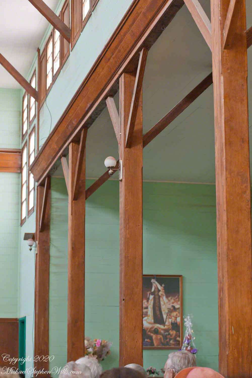 And in the arch’s corner, an angel descends—painted simply, yet with care. The figure pulls at a rope, perhaps to ring a bell or lift a curtain, a symbolic act of revelation or invitation. With wings green and soft, a skirt patterned in red flowers, suggesting femininity, grounding the divine in local textile tradition. The angel bridges the earthly with the divine, echoing the mission’s purpose: to guide and accompany.