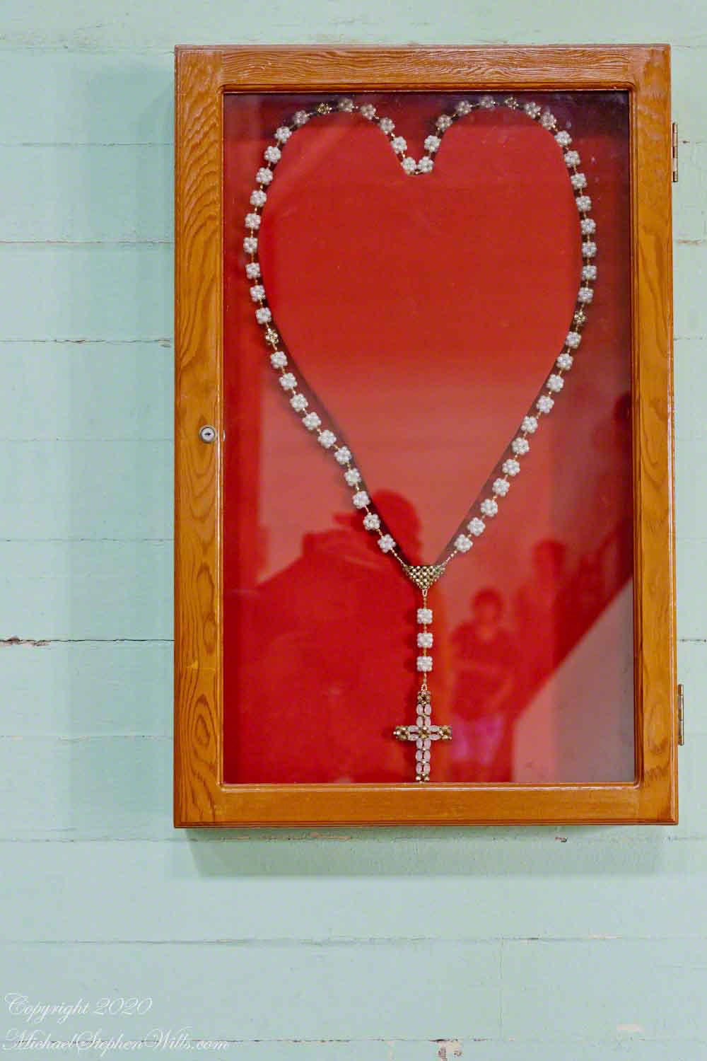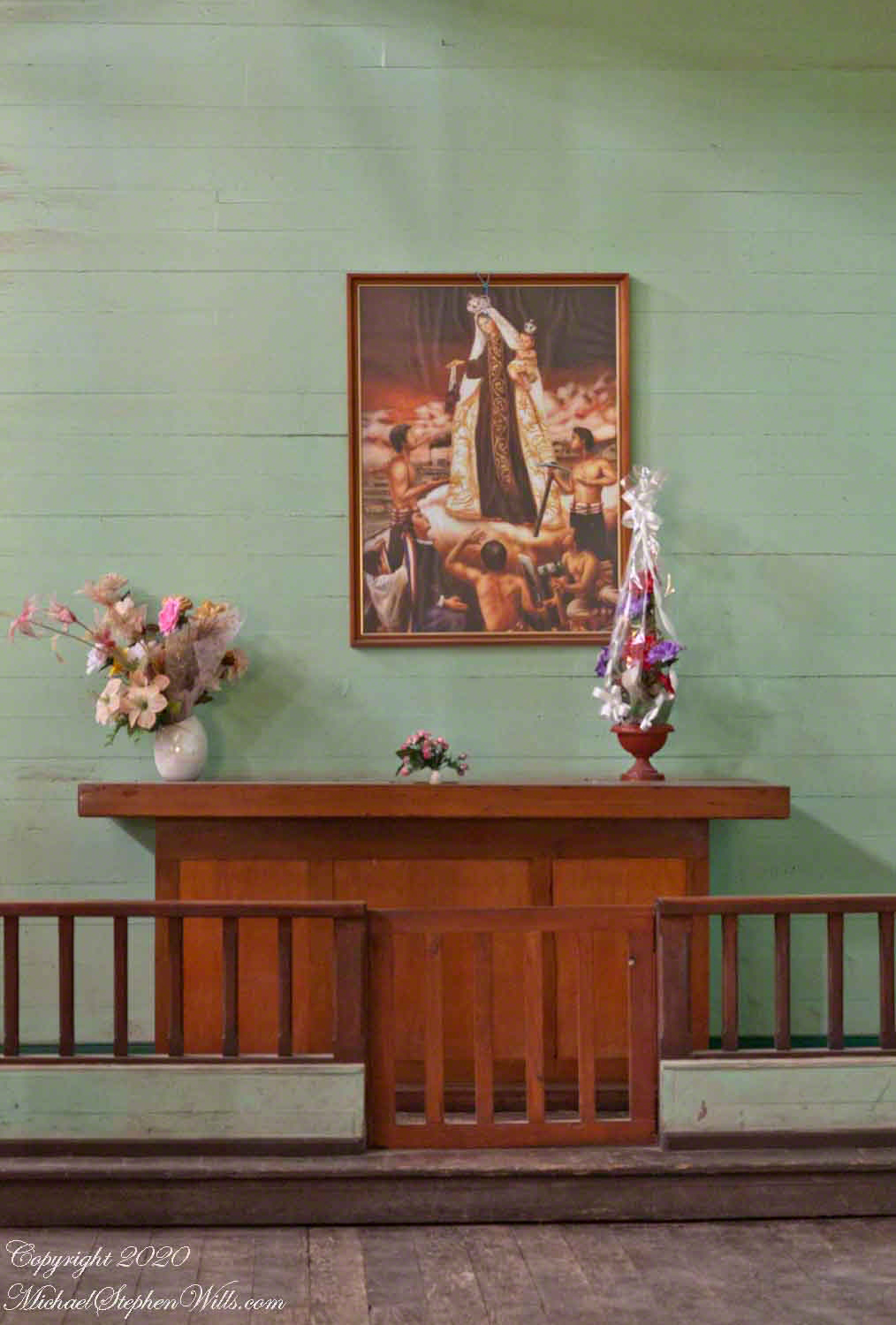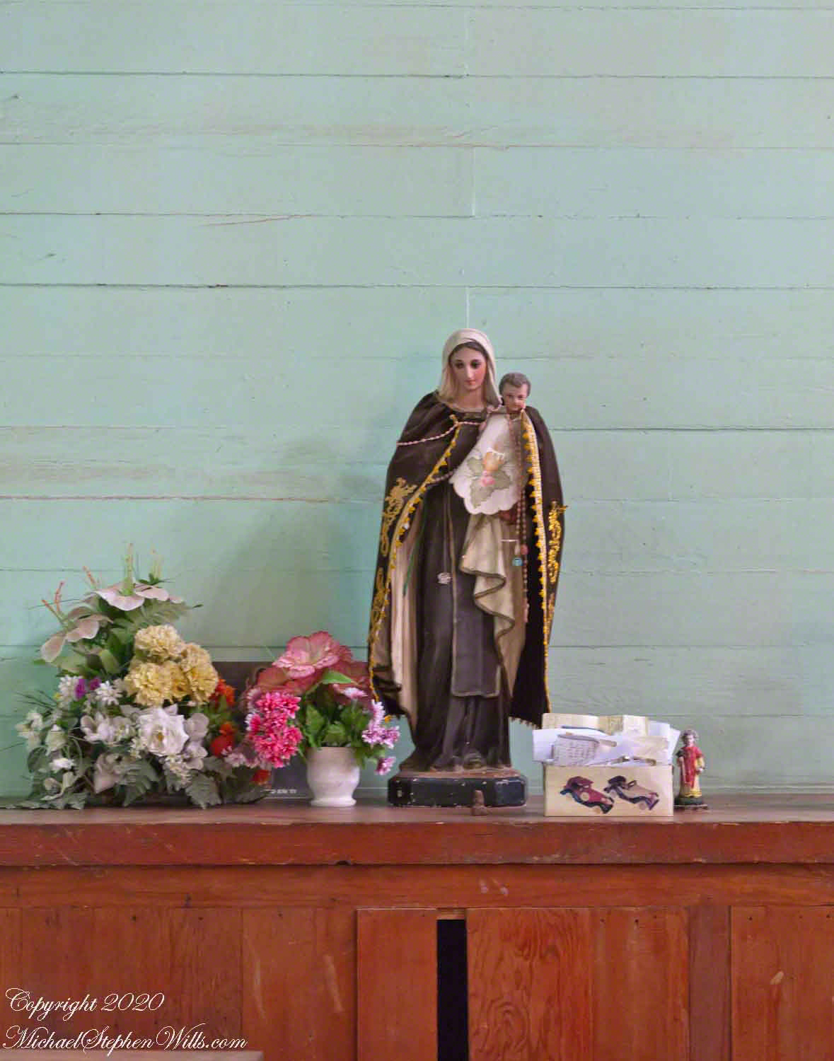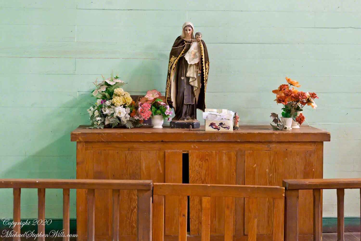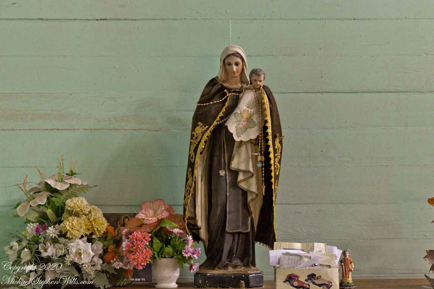 The Virgin Mary appears in blue and white—colors of purity, serenity, and devotion. She stands among votive candles and gazes gently ahead, hands joined in prayer. Her dress flows around her, anchored by a rosary that loops downward like an anchor to the earth. Angels and cherubs flank her in painted stucco, echoing heaven’s embrace. This is not the triumphal Mary of high cathedrals but a deeply human one, a mother, accessible and protective. The candles flickering below affirm that faith is alive here, not simply preserved.