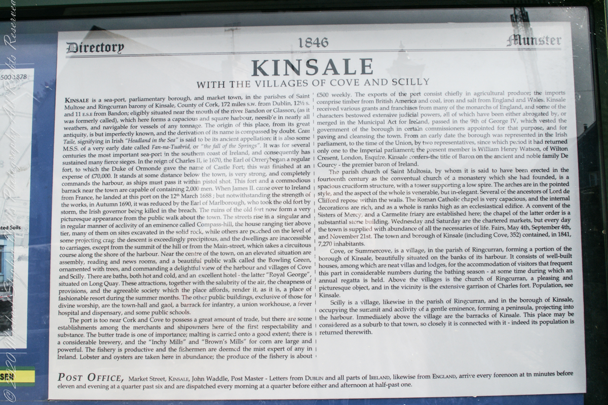 Text from an poster behind glass accessible to all and sundry. Directory 1846 Munster, Kinsale with the villages of Cove and Scilly. Kinsale is a seaport, parliamentary borough and market town in the parishes of Saint Multose and Ringcurran barony of Kinsale, County of Cork, 172 miles s.w. from Dublin, 121/2 s and 11 e.s.e. from Bandon; eligibly situated near the mouth of the river Bandon or Glasson, (as it was formerly called), which here forms a capacious and square harbor, accessible in nearly all weathers, and navigable for vessels of any tonnage. the origin of this place, from its great antiquity, is but imperfectly known, and the derivation of its name is compassed by doubt. Cean Taile (Cionn tSáile), signifying in Irish “Headland in the Sea” is said to be its ancient appellation. (see more in the photograph).