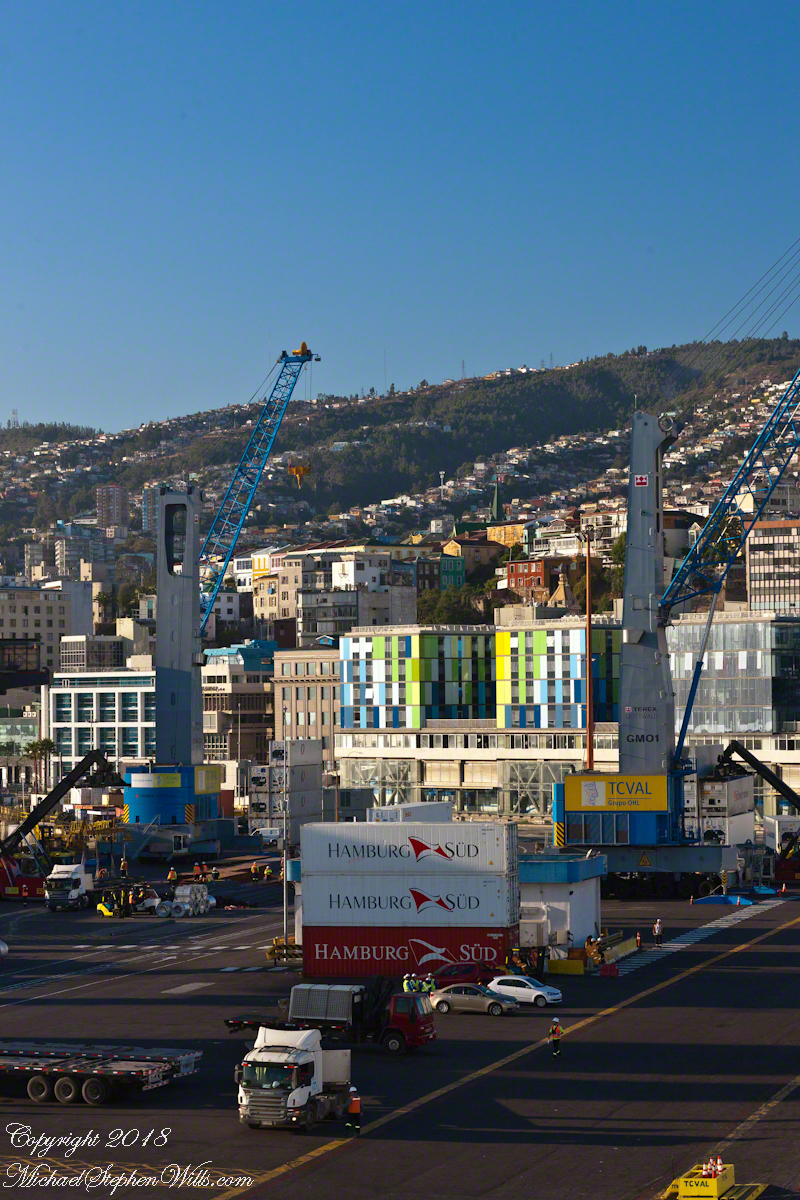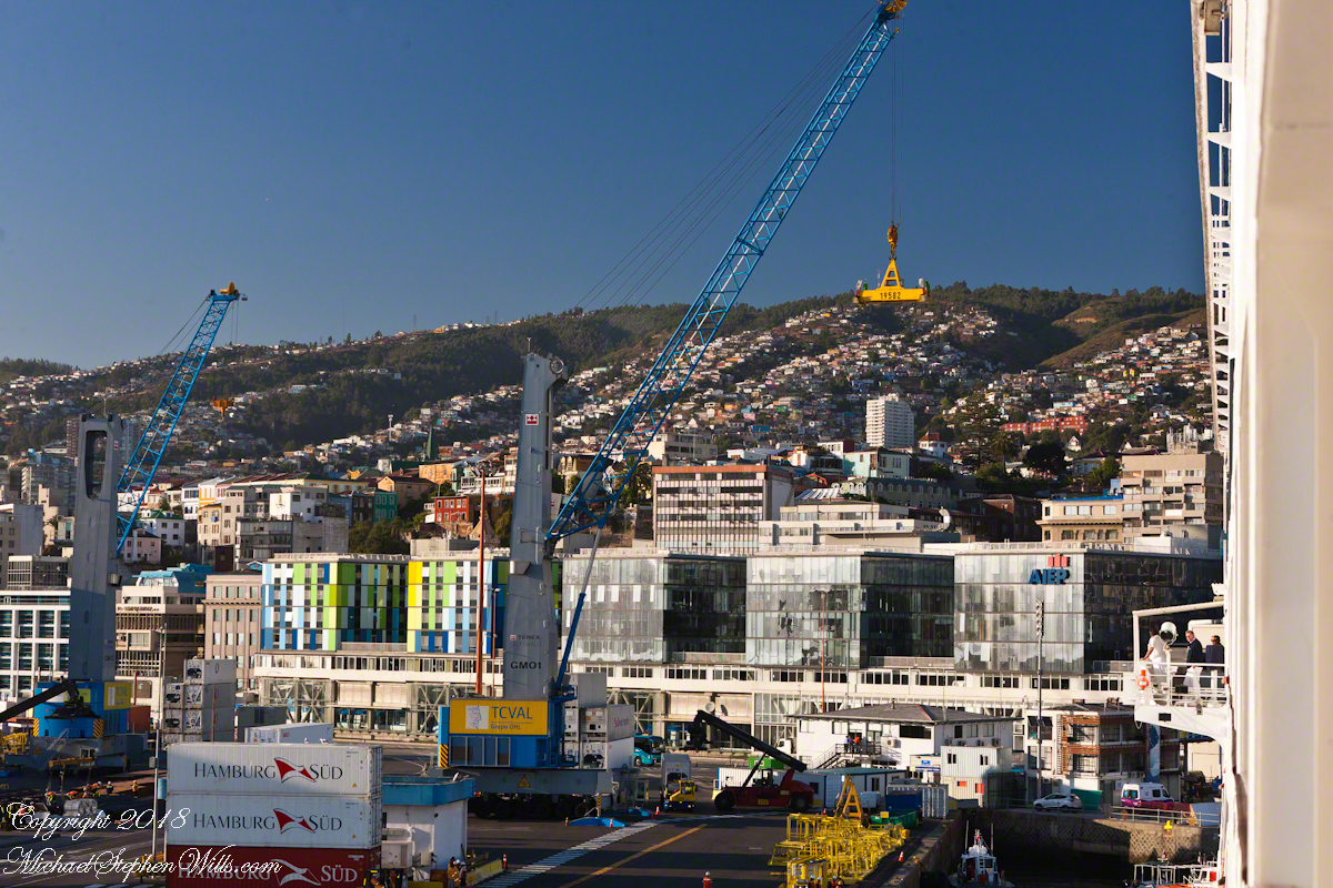Looking along the port side of the Regatta. Our room was on the same level as the bridge, visible on the right with several Regatta officers enjoying the Valparaiso port view. From here, the shipping containers (“Hamburg SUD”) are loaded onto semi-tractor trailers for points all around South America, they call the southern most land “The Cone.”