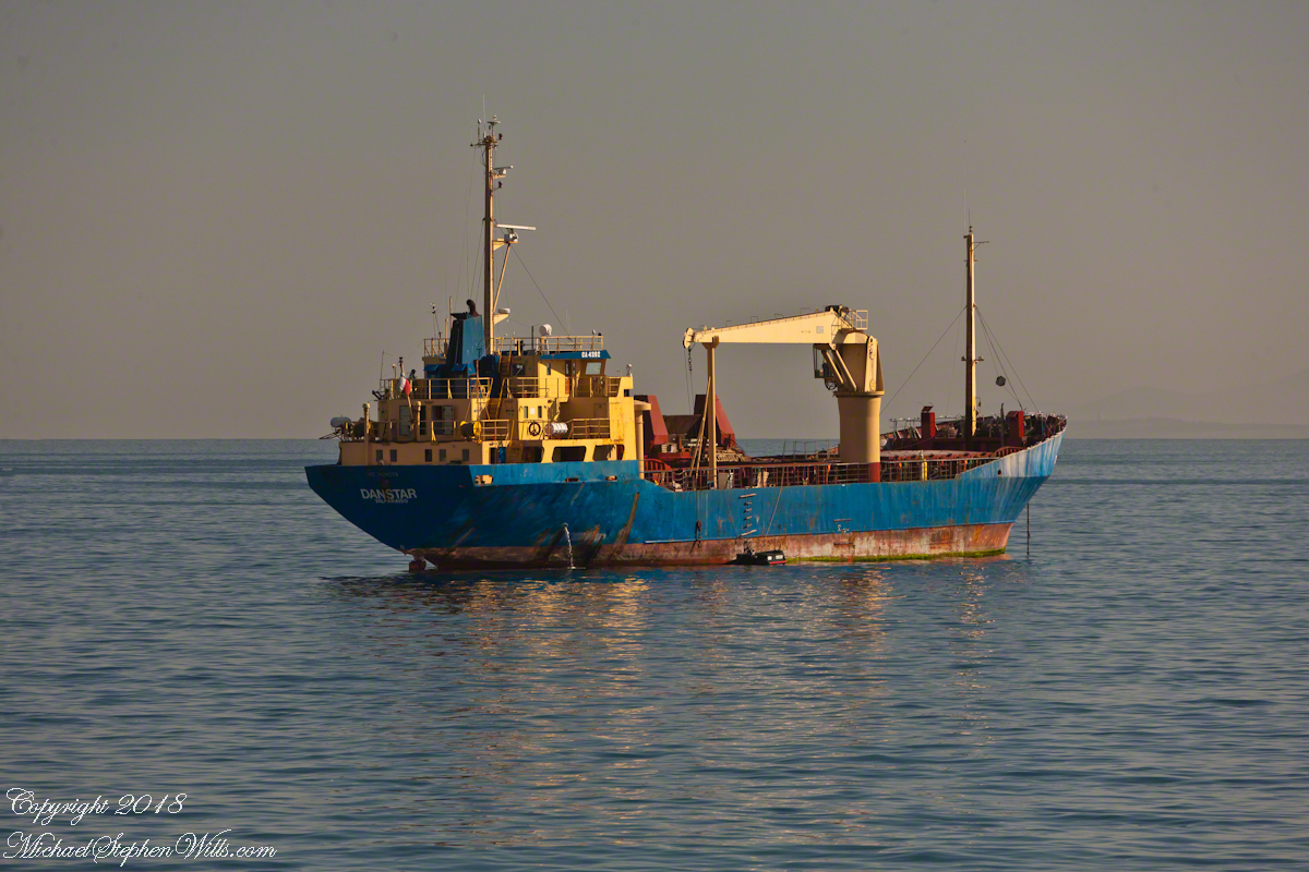 Named “Danstar” home port Valparaiso, the Chilean flag hangs stern side. A general cargo ship, I looked it up. On the day I started this post, it was sailing the southern pacific heading from Hanga Roa, Easter Island. The label on the bridge, CA 4392, is the radio call sign. The bilge pump is working….wonder how strict the pollution stands are for Valparaiso harbor?