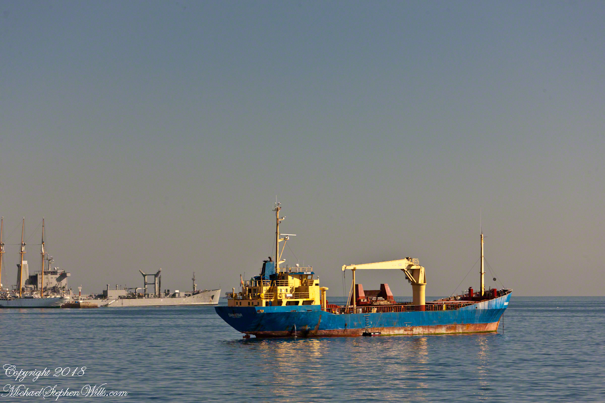 We’ve looked right. To the left a view of the port opens. War ships in the distance. Foreground is a general cargo ship, the crane midship is used for unloading in smaller ports. Currently unloaded, we can tell by how high it is riding. There is a rope ladder on the visible starboard side, a landing boat with an outboard motor along side. One person is visible on the upper deck, wearing a baseball cap.