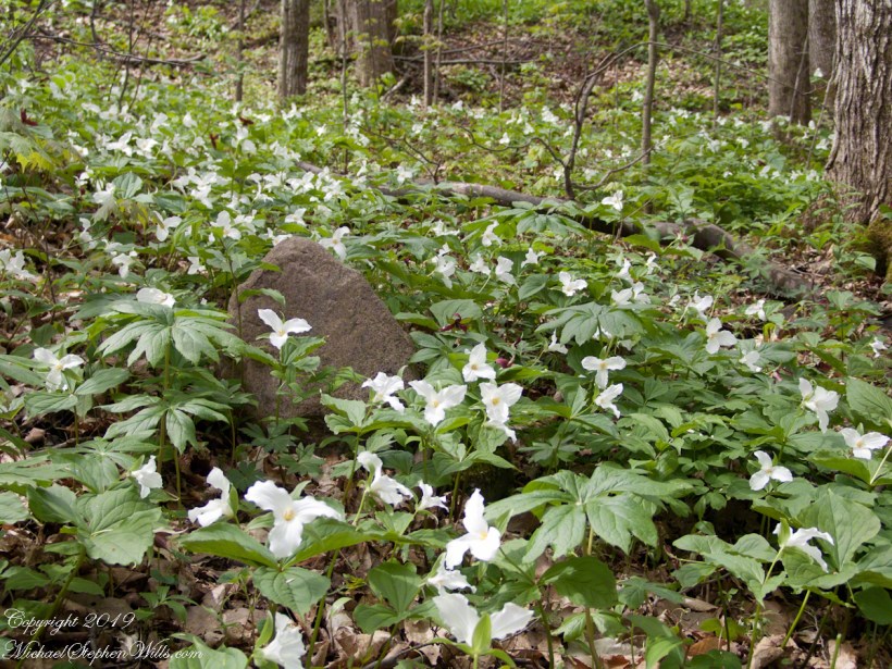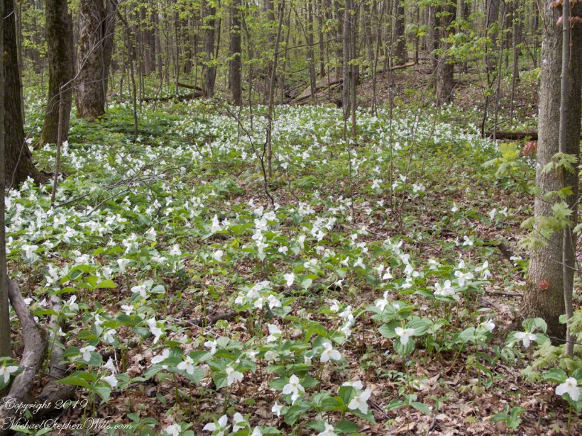 A week later, I wander the lush gorge of Fillmore Glen. The trail is alive with birdsong and the rush of a creek. Dappled sunlight slips through the greening canopy, illuminating patches of the forest floor. Rounding a bend, I catch my breath — the hillside ahead is blanketed with hundreds of white trilliums, a breathtaking constellation of blooms across the ground that feels almost sacred. Careful not to tread on any, I step closer to admire them at eye level.