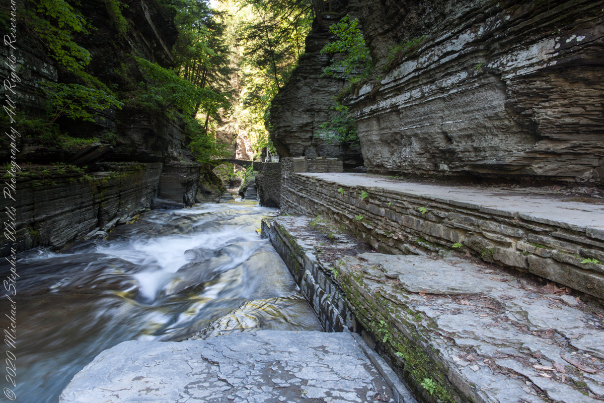 Treman Gorge Trail from the Old Mill enters a narrow gallery looking here southeast along Enfield Creek, passing over a stone footbridge. I climbed down into the stream bed for this shot, this first exposure of this series. All are from the Canon ES-1Ds Mark III mounted with a Canon 24 mm f/1.4L II USM lens, on a Manfrotto studio tripod and hydrostatic ball head.