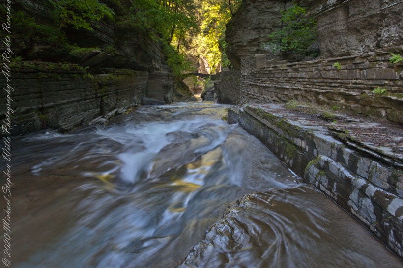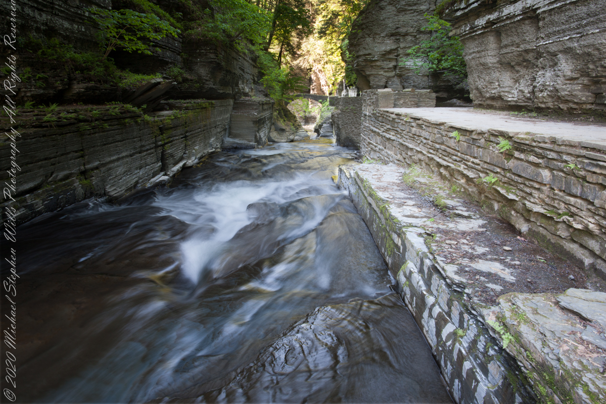 At the gallery entrance a flat limestone flagstone emerges a few inches from the flowing water. It is here I placed the tripod, different than the previous day’s exposures in that the tripod is lowered, closer to the water and path on right is not visible. Only the shutter speed is different between these two exposures.