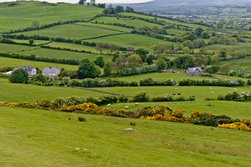 Here we are looking south, southwest from the north side of Slieve na Calliagh (aka Cairnbane East) toward Cairnbane West. Flowering yellow whin bush is in foreground, white flowering hawthorn trees in distance.
