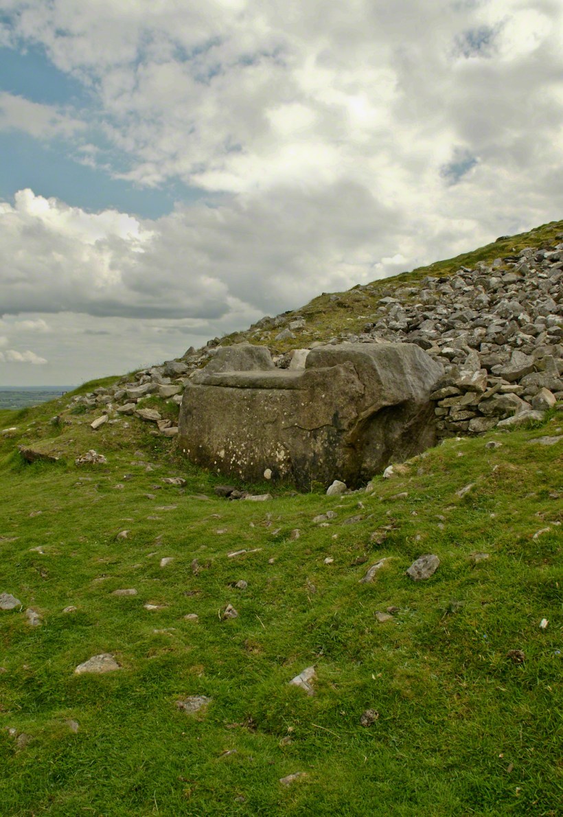 On a May afternoon my dear wife, Pam, and I climbed to the summit of in Irish “Sliabh na Caillí” anglicized as “Slieve na Calliagh” translated to the english language as “Hag’s Mountain”, the site of 5000+ year old megalithic monuments. Here you are looking to the northeast with a collapsed tomb to the right foreground. In closeup is a curbstone, one of many laid side to side to form the outer tomb margin. In the middle distance is a hill with additional megalithic ruins, not visible.
