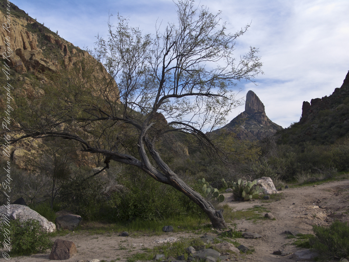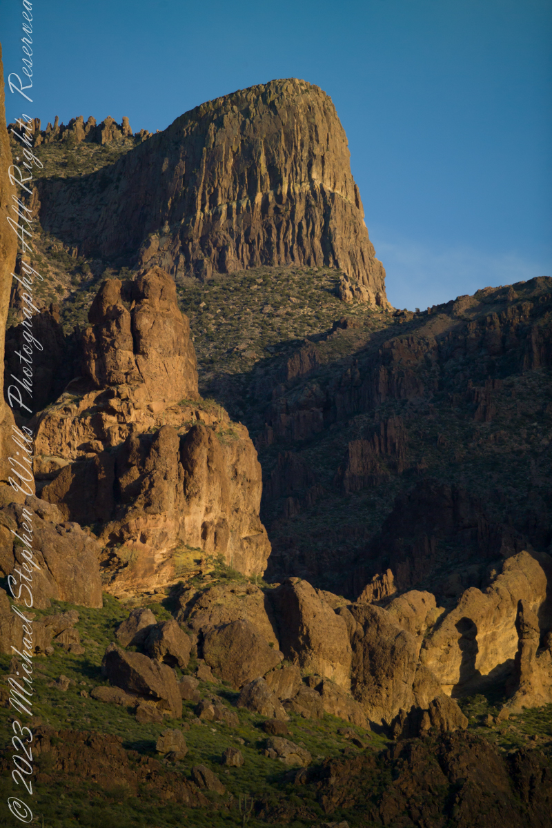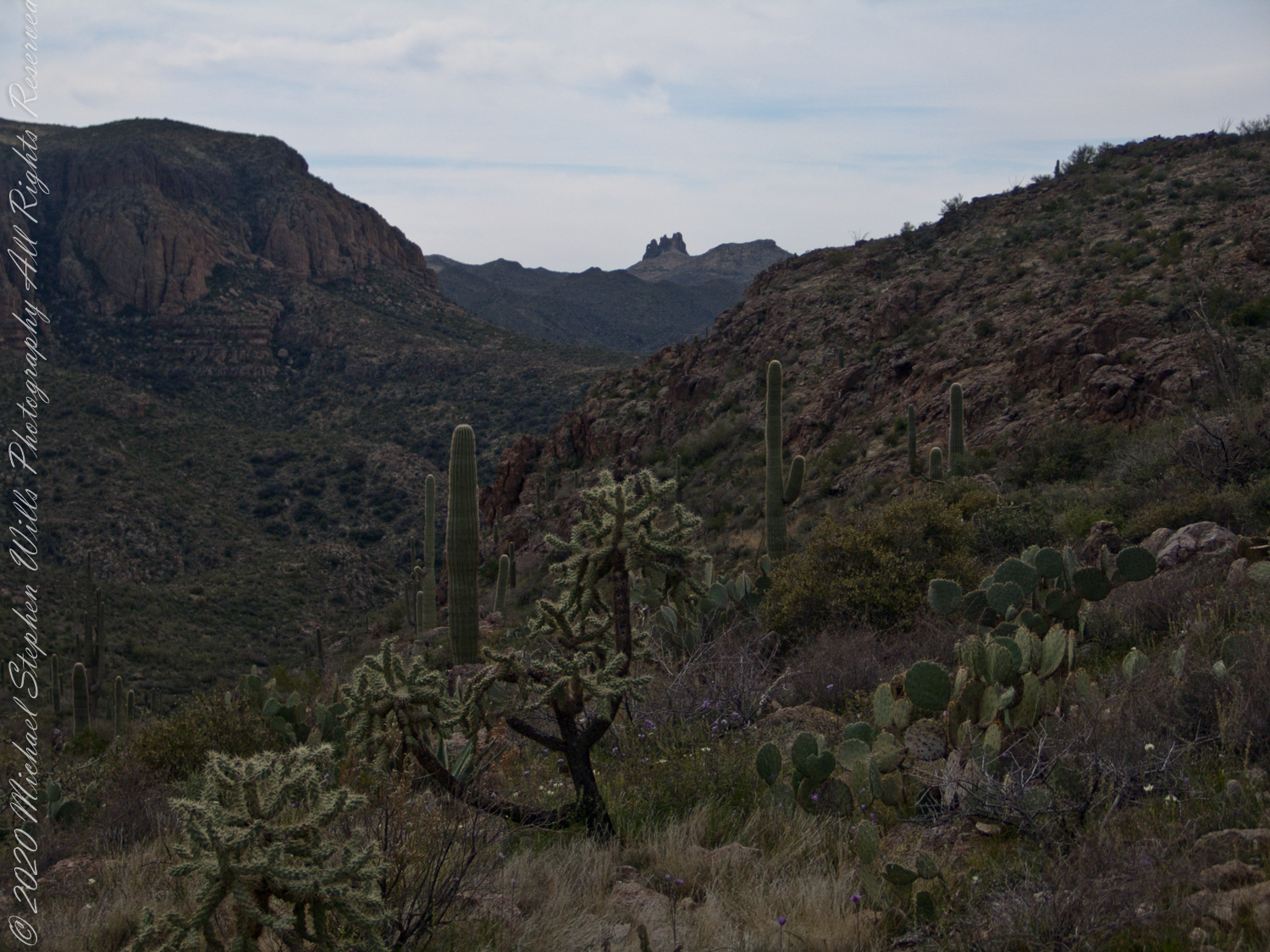 Many wildflowers, sprinkled like stars through the foreground of the morning photograph with Prickly Pear, Cholla and Saguaro cactus. Beware of “Jumping Cholla”, named for its seeming ability to attack passers-by. Another name, “Hanging Chain Cholla”, is more appropriate. Each chain with many hooked barbs is lightly attached to the branch, ready to snag a ride from unwary hikers.