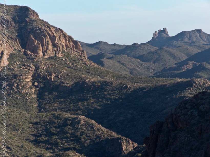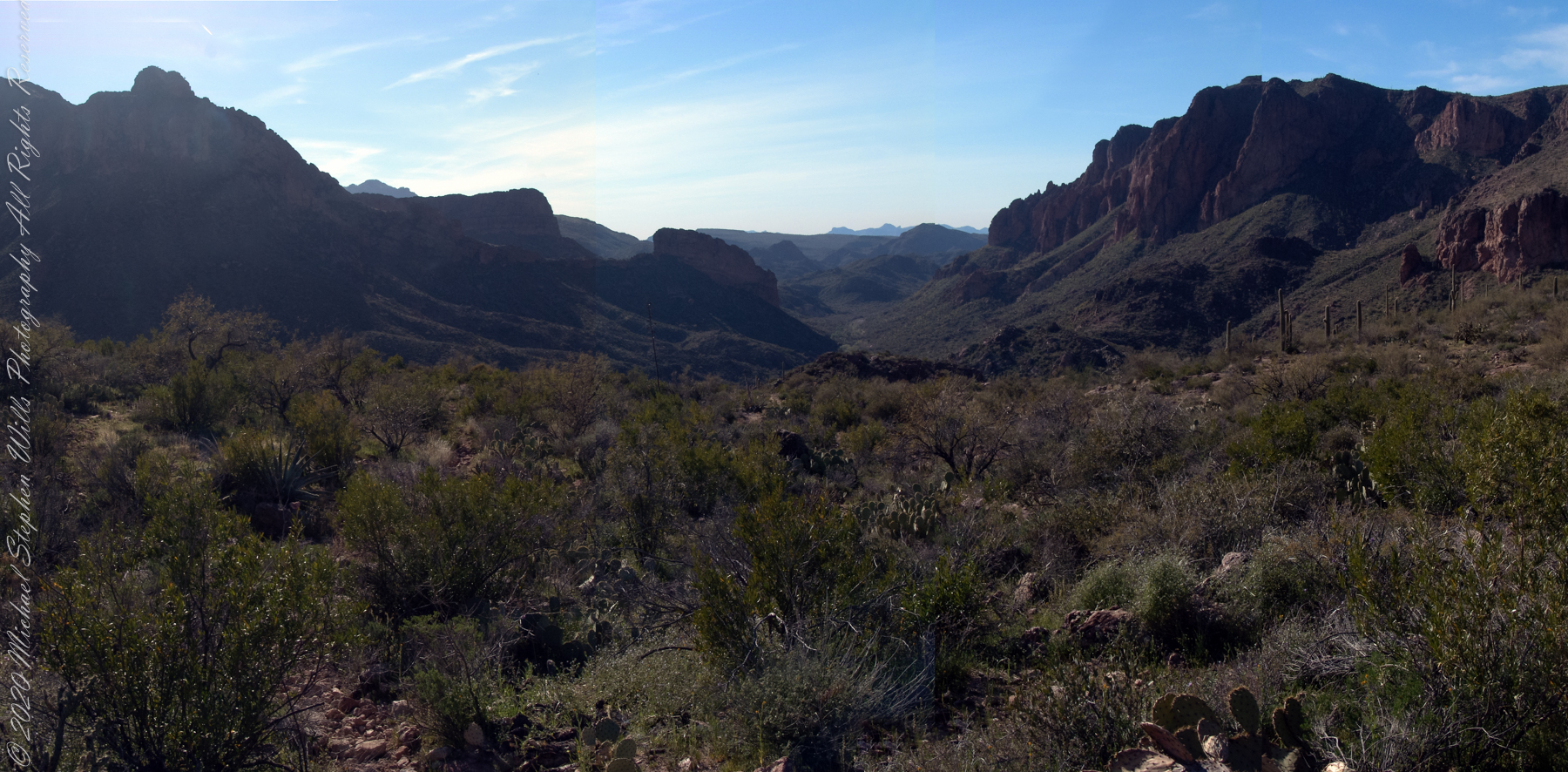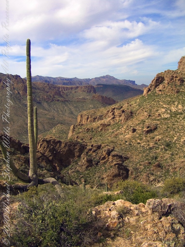 View North / Northwest from Peter’s Mesa. At our feet is a mature Saguaro Cactus towering over Charlebois Canyon, to the right Black Mountain. Bluff Spring Mountain, middle distance, then Black Top Mesa. Flatiron Peak, of the famed Superstition Mountain, is in distance. Photographed from Peter’s Trail on a March afternoon 2008. Superstition Wilderness, Tonto National Forest, Arizona
