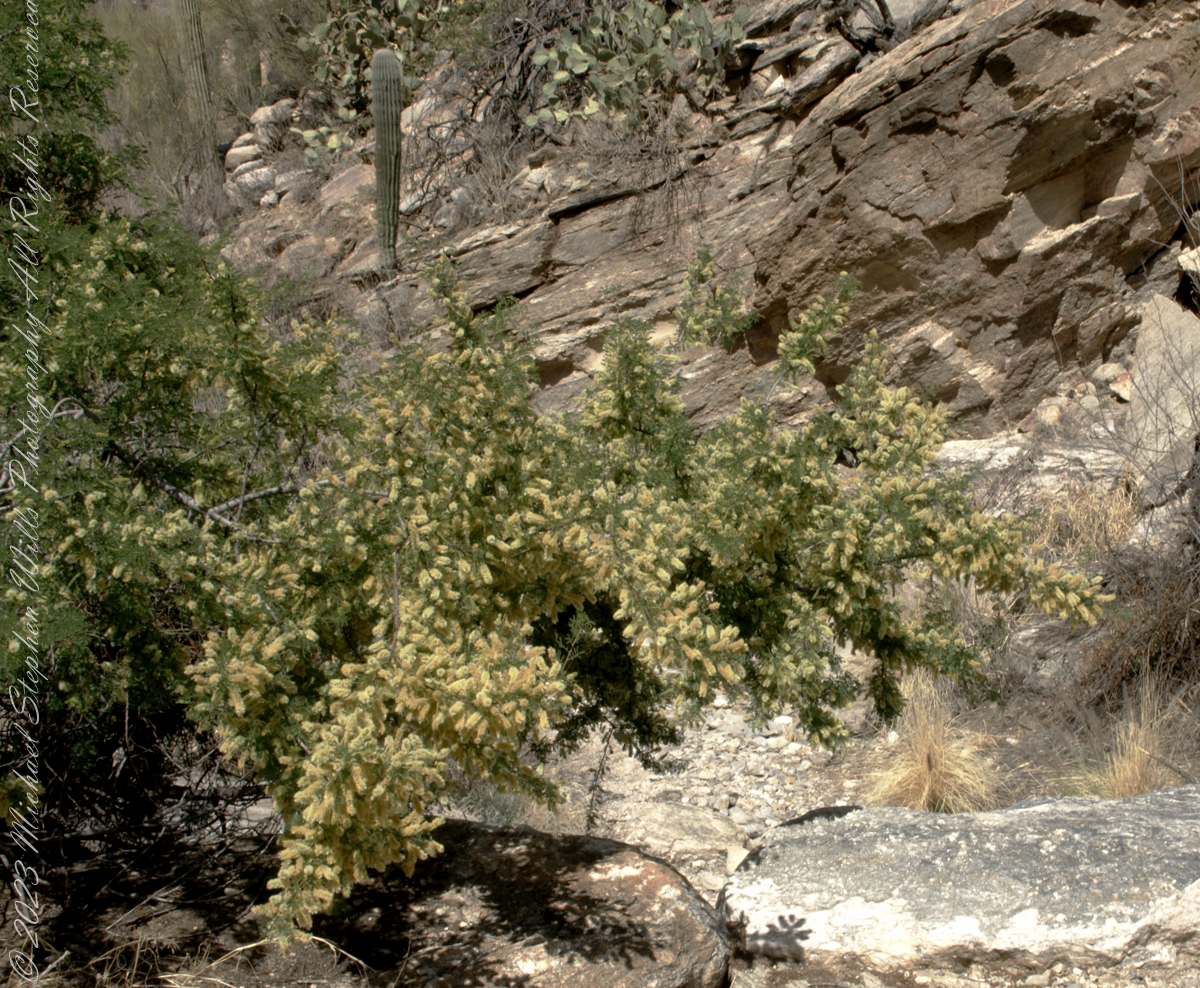 I found this flowering mesquite bush in Finger Rock Canyon of the Catalina Mountains outside Tucson, Arizona.