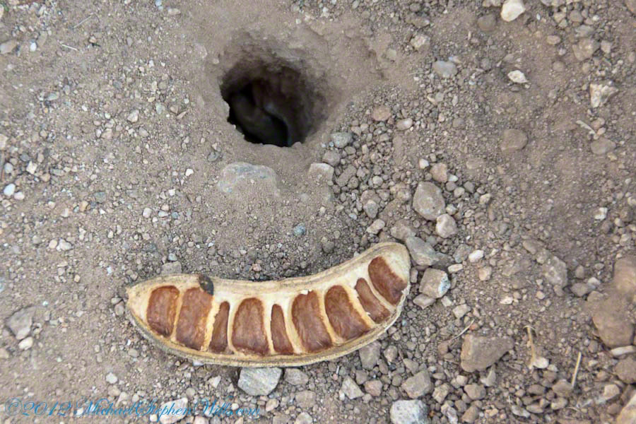 The plentiful legumes that develop from these flowers are edible when cooked. The shape and color of the seeds can be understood from this empty seed pod that happens to lie near a tarantula burrow.