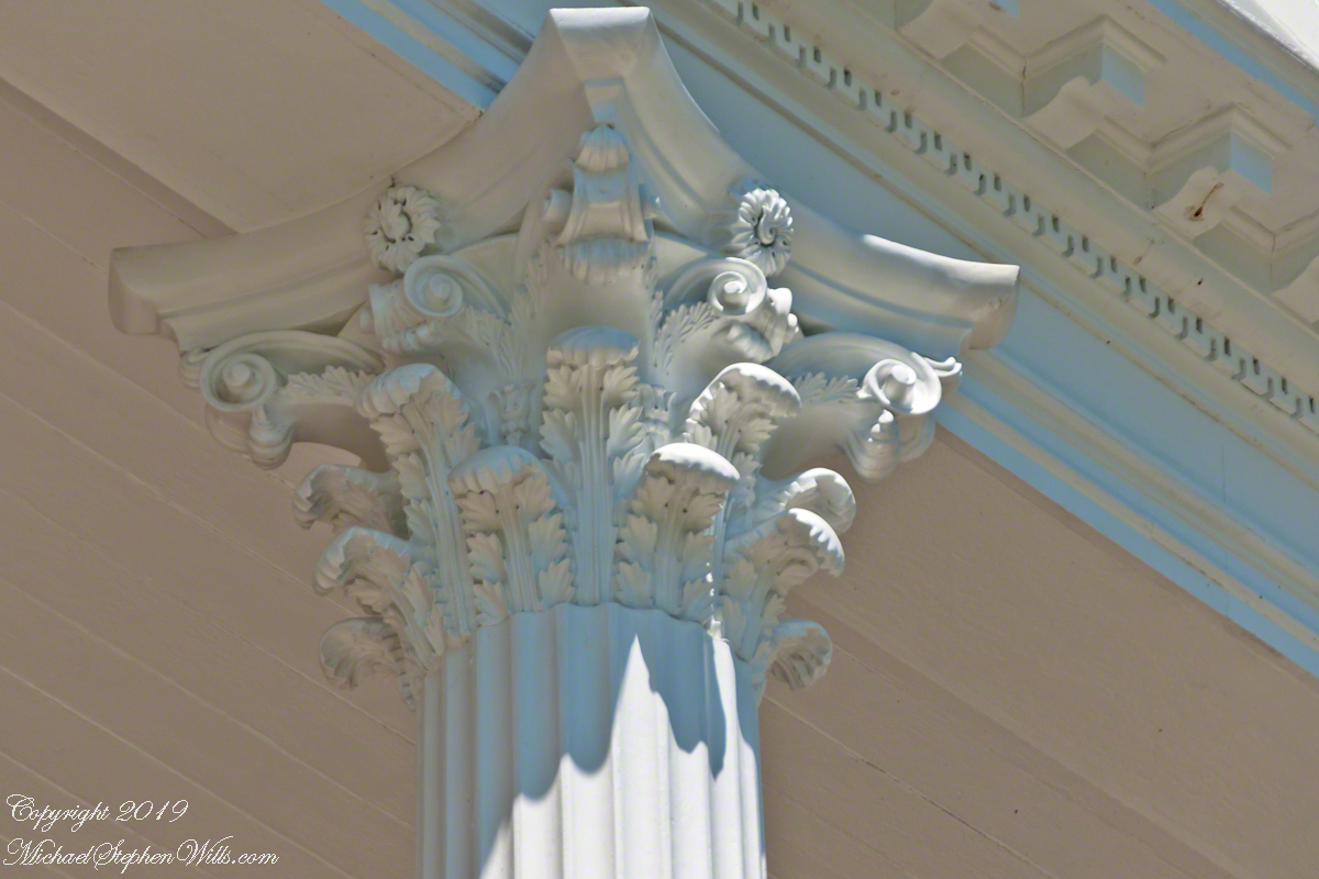Here is a different angle on the porch trim to include the porch’s fancy balusters and rails. The decorative head on the window is wonderful. The private owner recently renovated the property, there is a building permit still posted in the window.