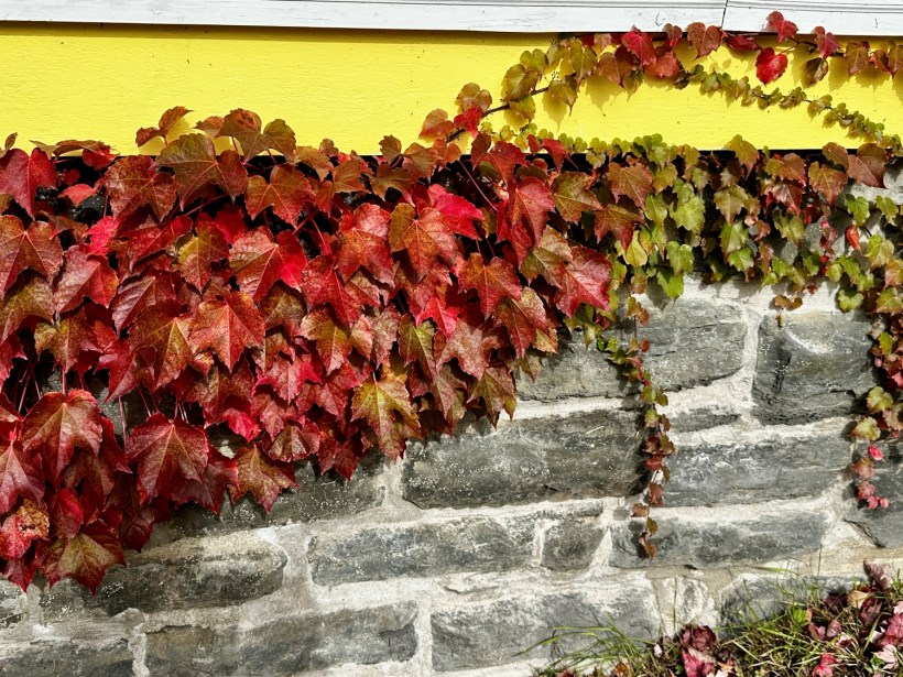Nearby, I noticed a vine-covered wall where vibrant red leaves cascaded down toward the stone base. The color was striking—a reminder that, even as autumn wanes, nature’s palette reaches its most intense. The bright red vines against the textured gray stone created an almost painterly effect, as if nature itself had brushed the wall with strokes of crimson.