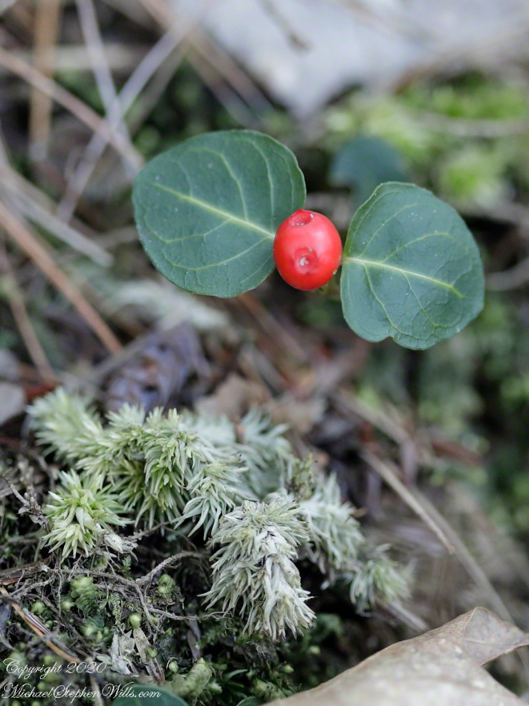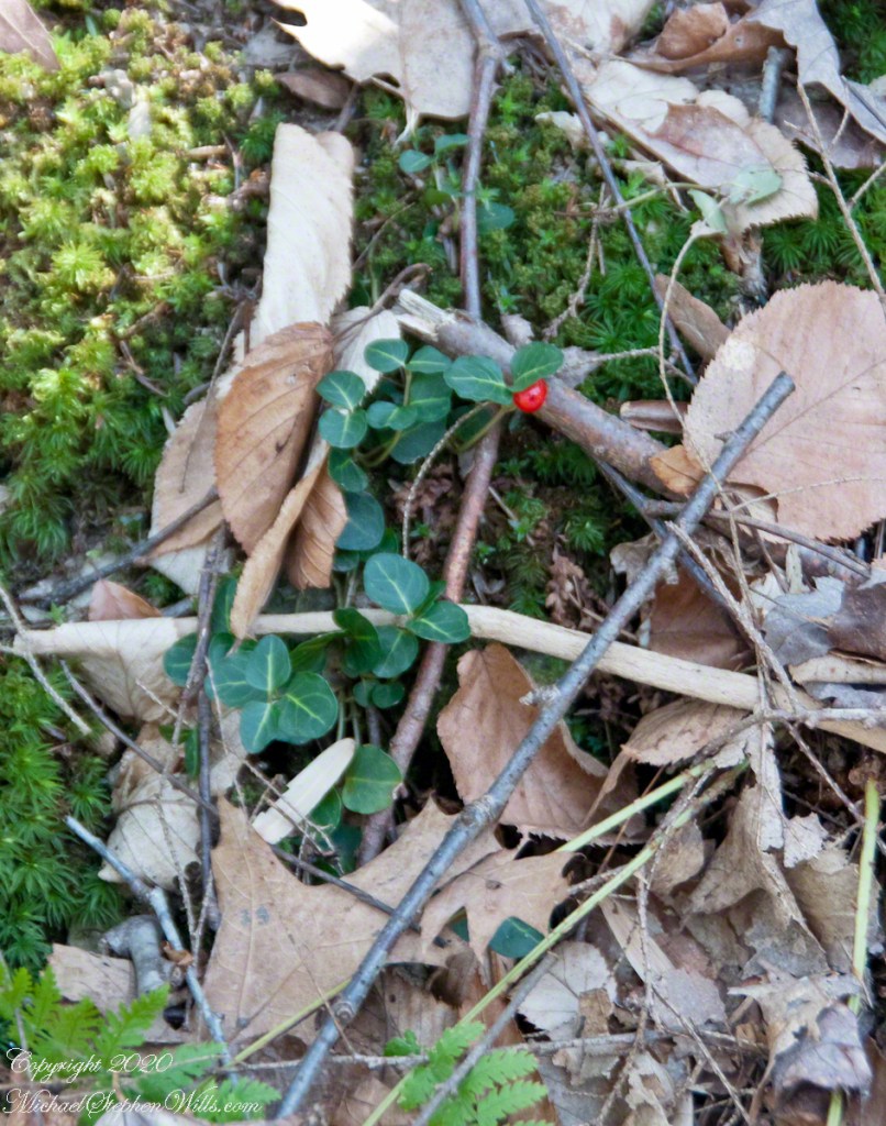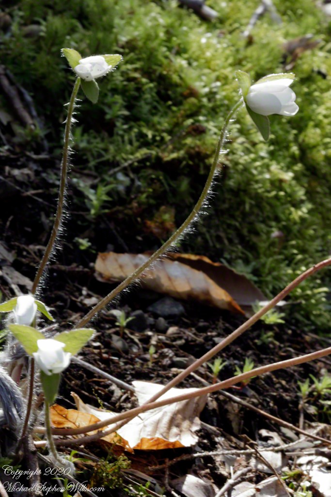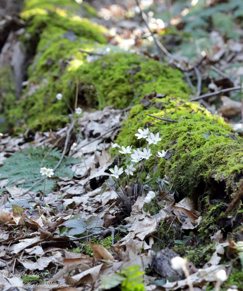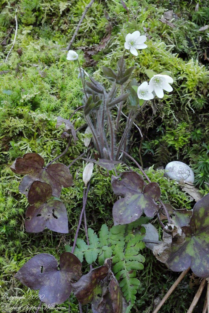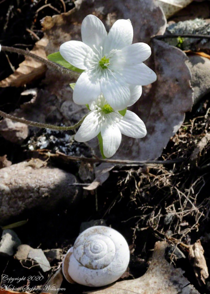 Hepatica blossoms are the focal point here. Two land snail shells rested fortuitously below, a white and dark brown. The white shell (Scientific Name: Neohelix albolabris) is seen here. In life, the shell aperture reflective lip gives the species name, from Latin root words “albo” (white) and “labris” (lip), and the popular name, “Whitelip.” Look closely to see a series of ridges, an identifying feature apparent in this specimen. There was a live specimen in our yard, just yesterday. Busy with chores, no camera at hand.