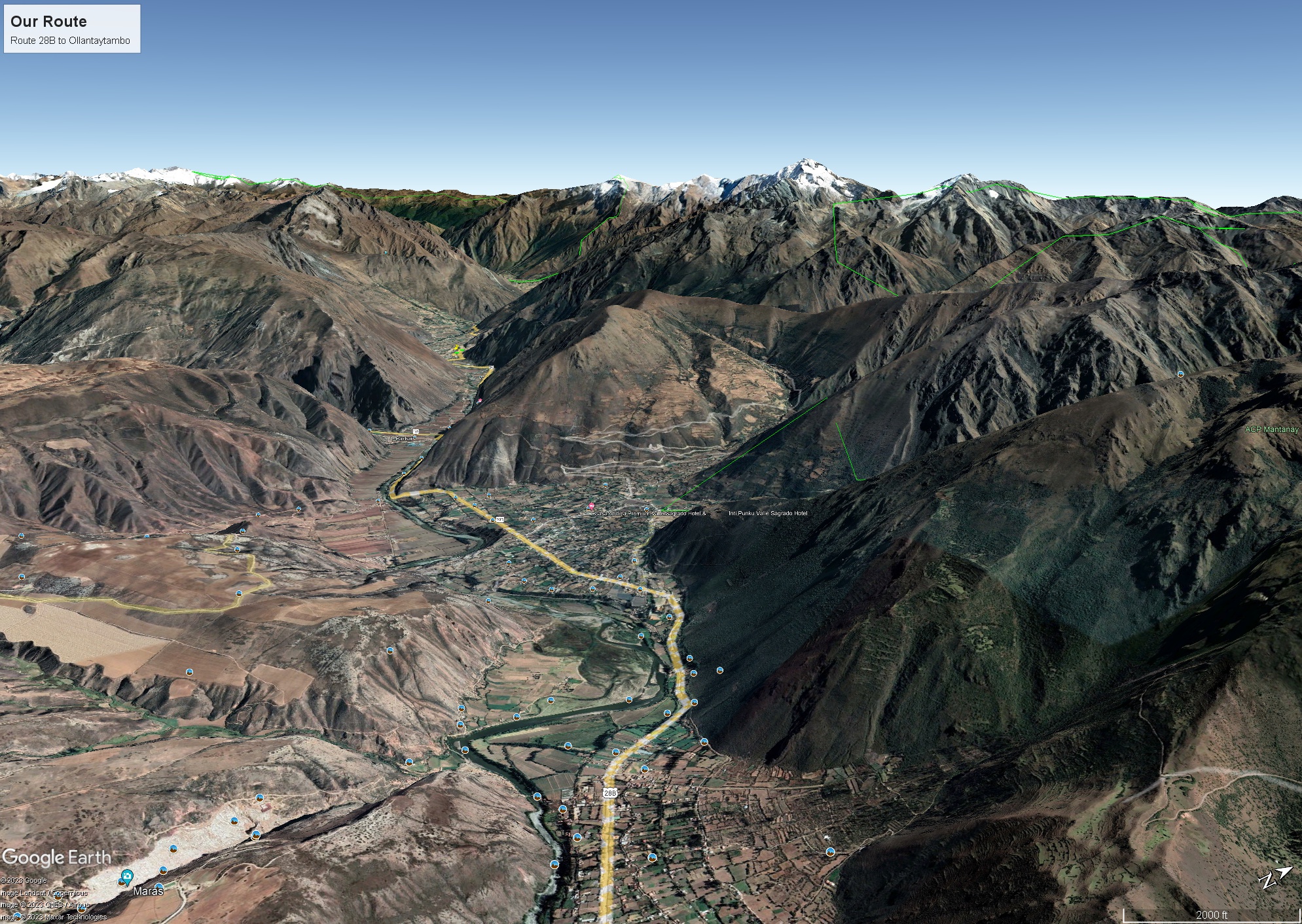 GoogleEarth: The approach to Aguas Calientes with Intipata Ruins at lower left
