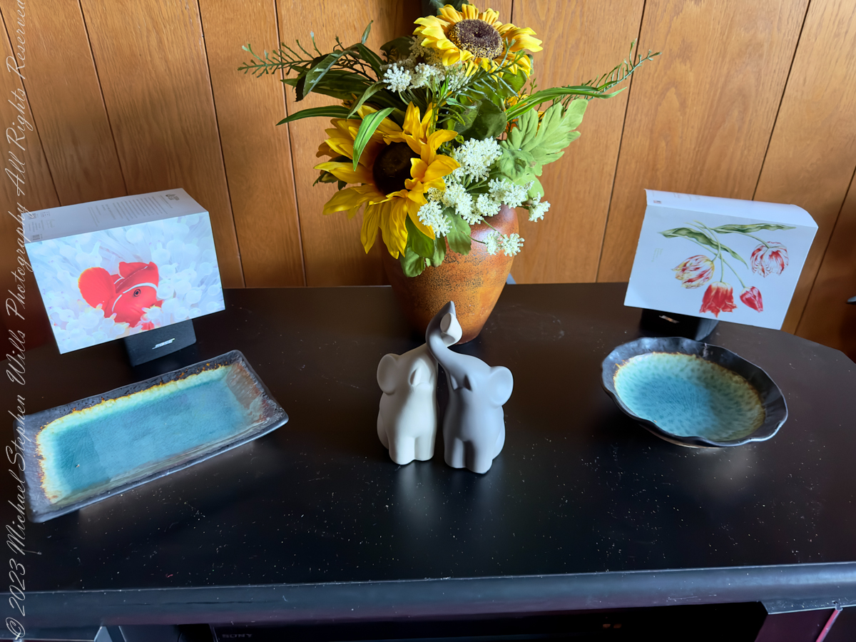 My card to Pam is on left, Her’s to the right. Pam presented these ceramic elephants to Michael on their 14th Wedding Anniversary, Monday, March 20, 2023. Ivory is the traditional gift for the 14th.