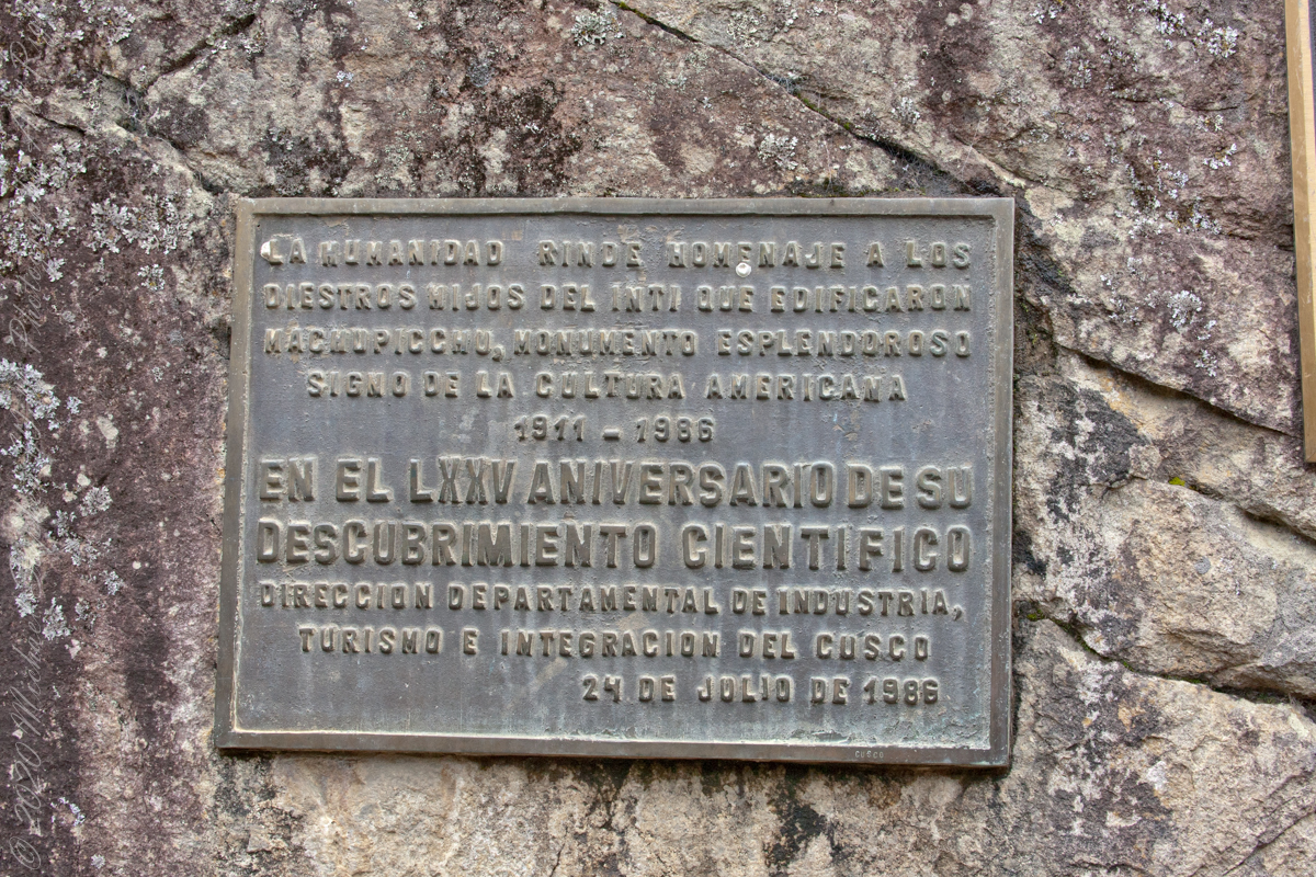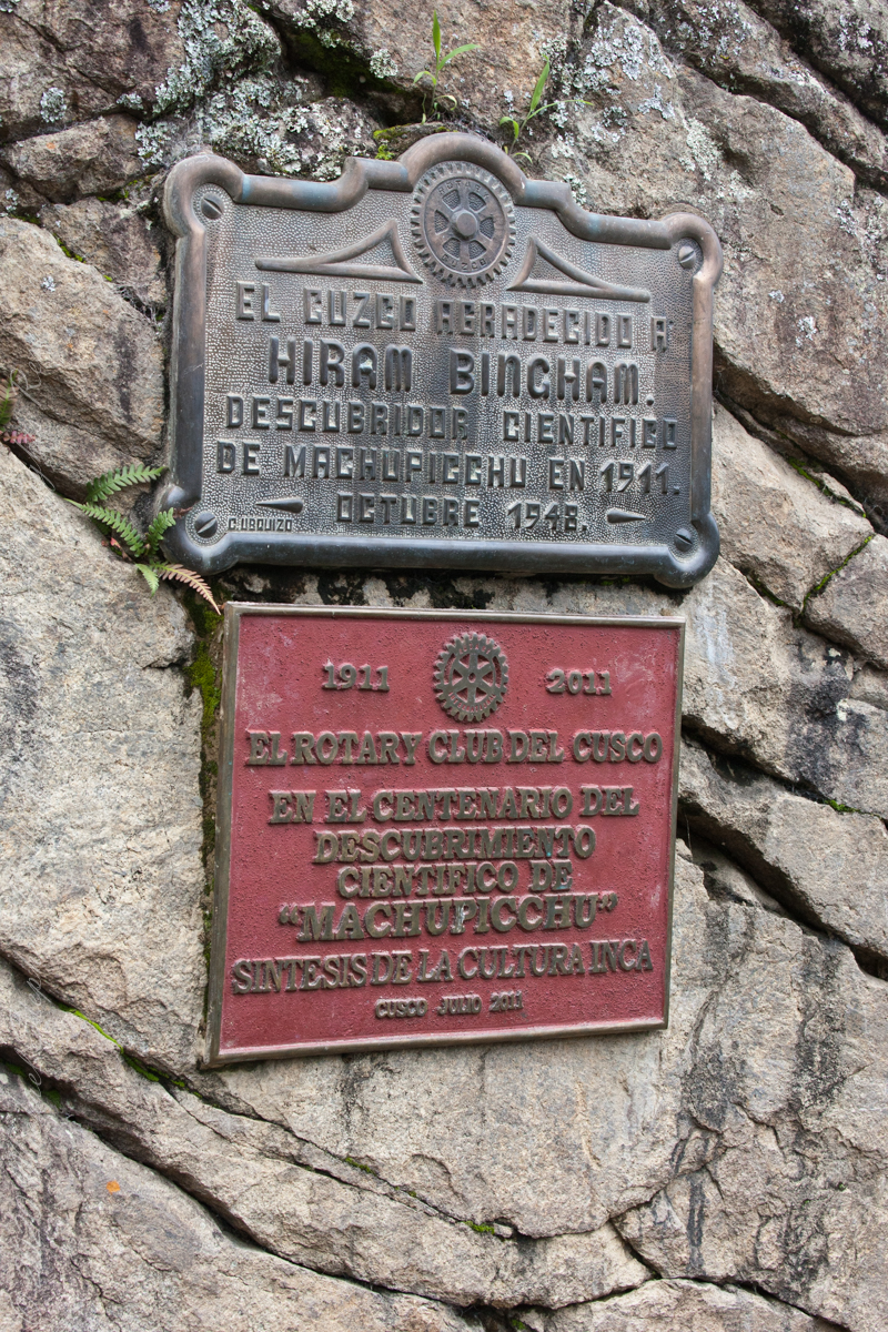 Top: El Cuzco Agradecido a Hiram Bingham Descubridor Cientifico de MachuPicchu en 1911. October 1948 (made by C Ubquizo) Translation (The City of ) Cuzco (is) Grateful to Hiram Bingham Scientific Discoverer of Machu Picchu in 1911. October 1948 Bottom: 1911 2011 El Rotary Club del Cusco En el Centenario del Descubrimiento Cientifico co “AMachuPicchu” Sintesis de la Culture Inca Cusco Julio 2011 Translation: The Rotary Club of Cusco In the Centenary of the Scientific Discovery of “MachuPicchu” Synthesis of the Inca Culture Cusco July 2011.