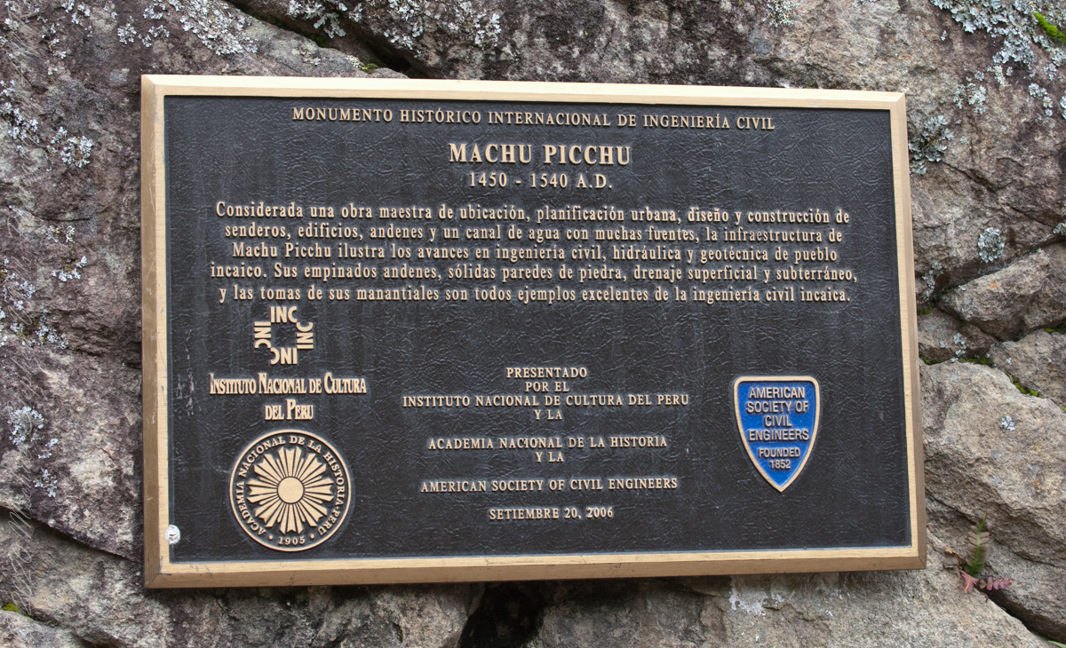 “Considerada una obra maestra de ubicacion, planificacion urbana, diseno y construccion de senderos, edificios, andenes y un canal de agua con muchas fuentes, la infraestructura de Machu Picchu ilustra las avances en ingenieria civil, hidraulica y geotecnica de pueble incaico. Sus empinados andenes, solidas paredes de piedra, drenaje superficial y subterraneo, y las tomas de sus manantiales son todos ejemplos excelentes de la ingenieria civil incaica.” Translation “Considered a masterpiece of location, urban planning, design and construction of trails, buildings, platforms and a water channel with many fountains, the infrastructure of Machu Picchu illustrates the advances in civil, hydraulic and geotechnical engineering of Inca village. Its steep platforms, solid stone walls, surface and underground drainage, and intakes of its springs are all excellent examples of Inca civil engineering. September 20, 2006.”