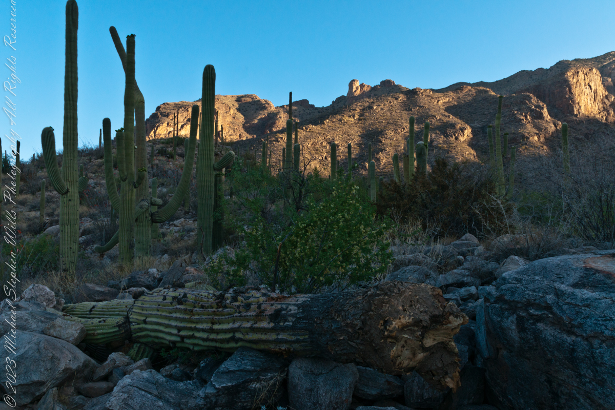 Early morning to the north / northwest looking over a 20-foot fallen Saguaro Cactus (Carnegiea gigantean), toward lower ridges of the Santa Catalina Mountains. The saguaro is among a stand of healthy fellows, some with new growth and flowers on the tips of arms and main columns. This giant must have grown over rock through 60 years. It was brought down when the roots weakened. Specimens that are more reliably rooted can live to 200 years.