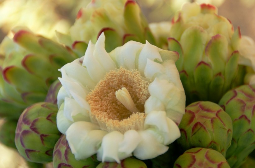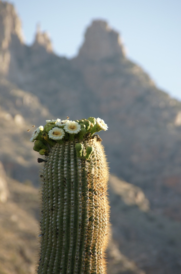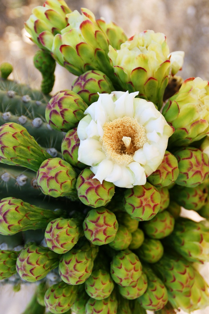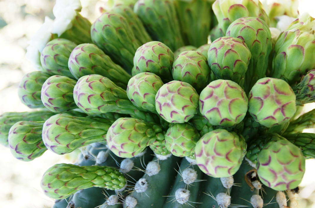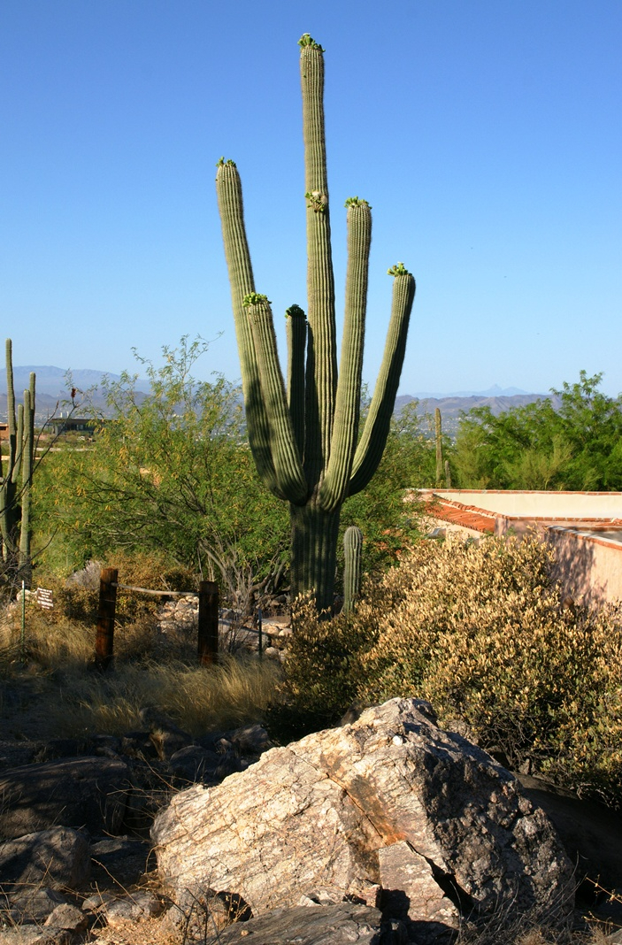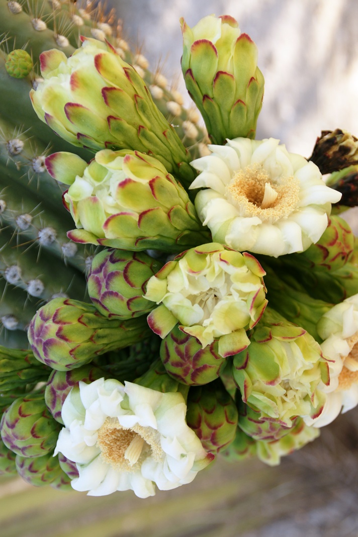 Saguaro flowers start as buds on the tip of the cactus body or arm. The specimen in the photograph below, growing in the yard of a foothills home on the border of federal land, is over 30 feet tall and, at the end of April 2011, buds are sprouting from every tip. Look closely for opening buds and full saguaro blossoms.